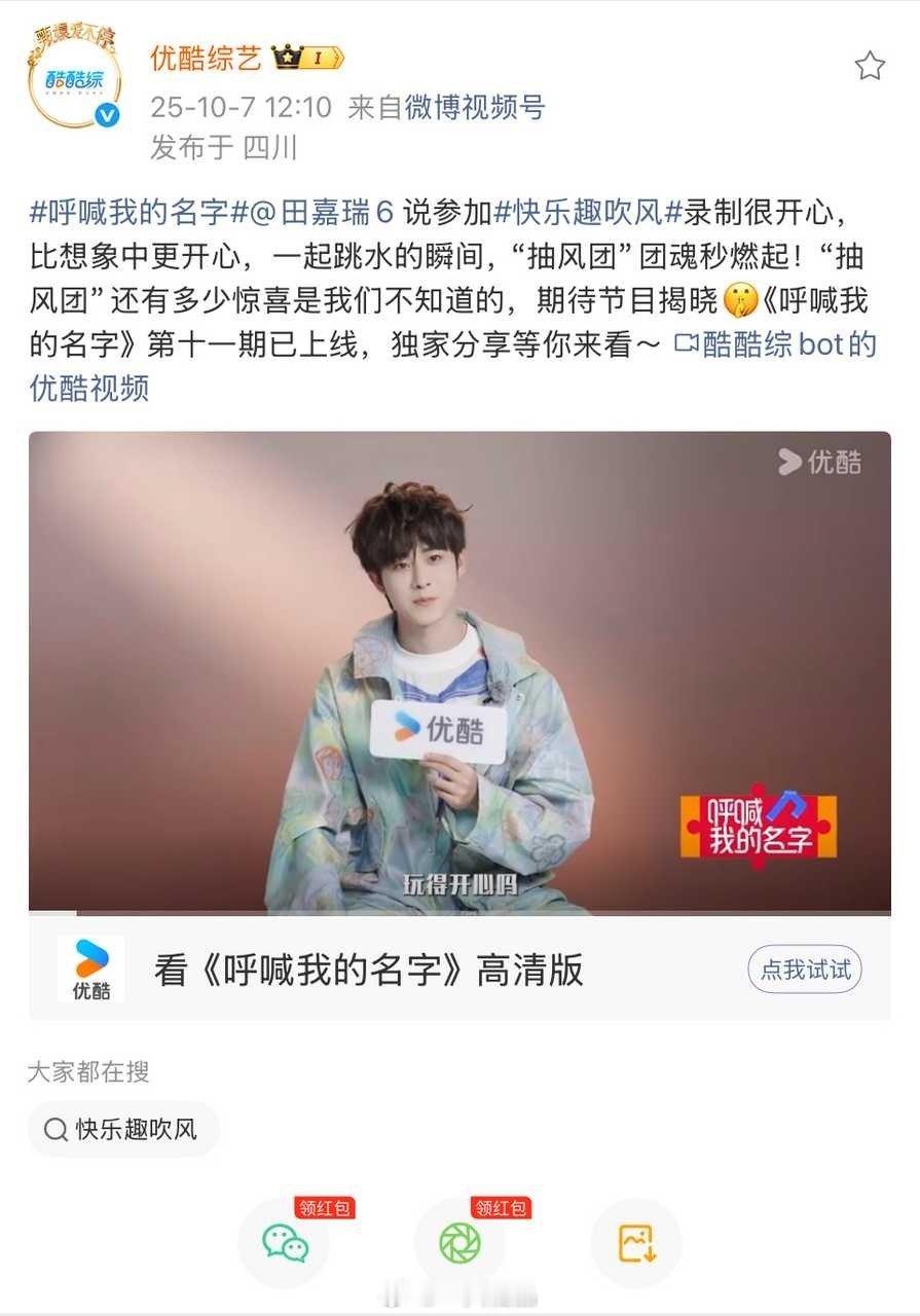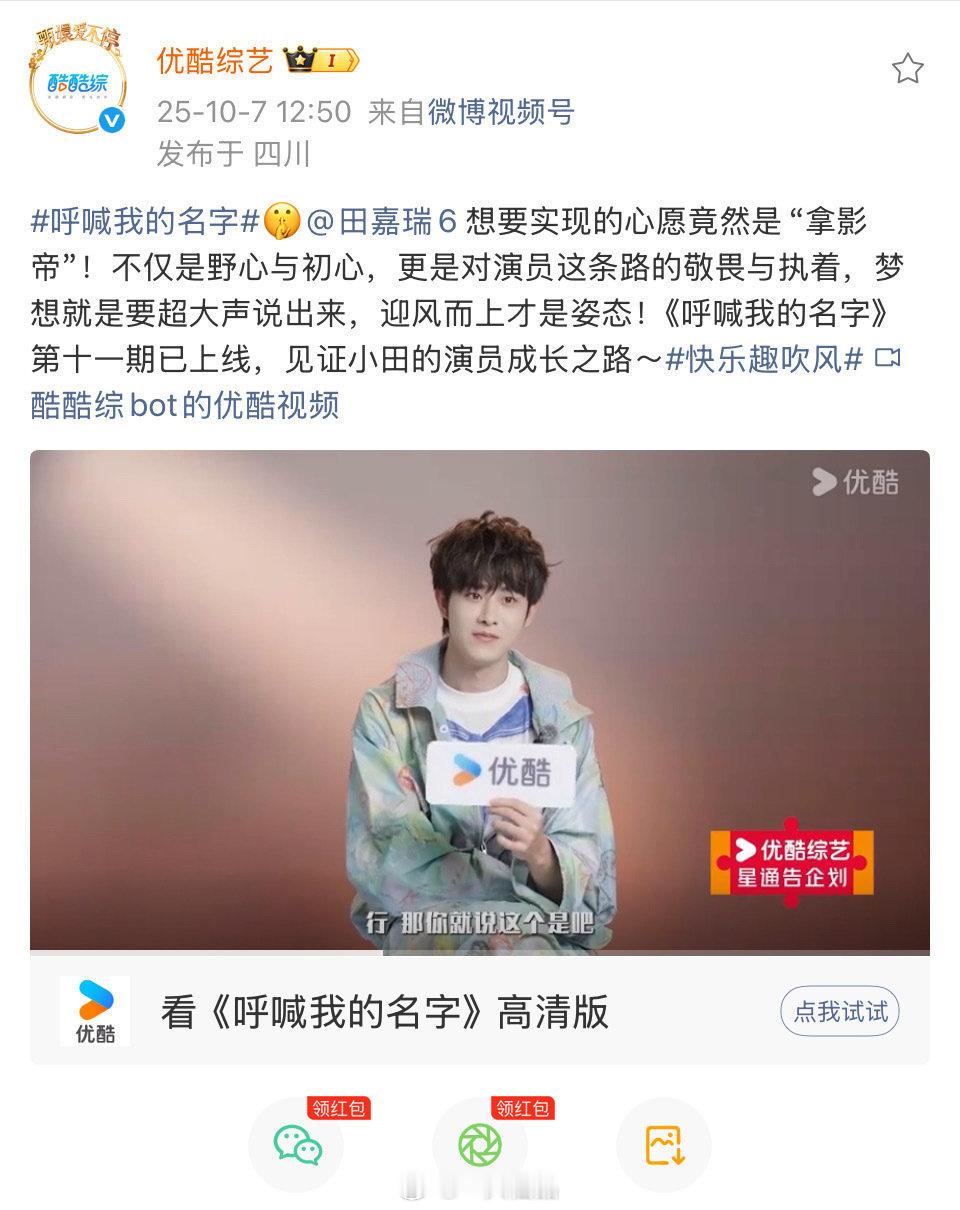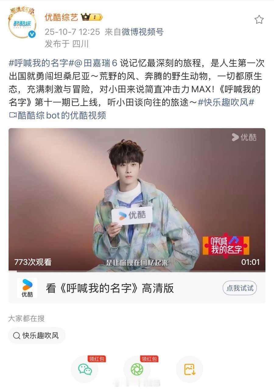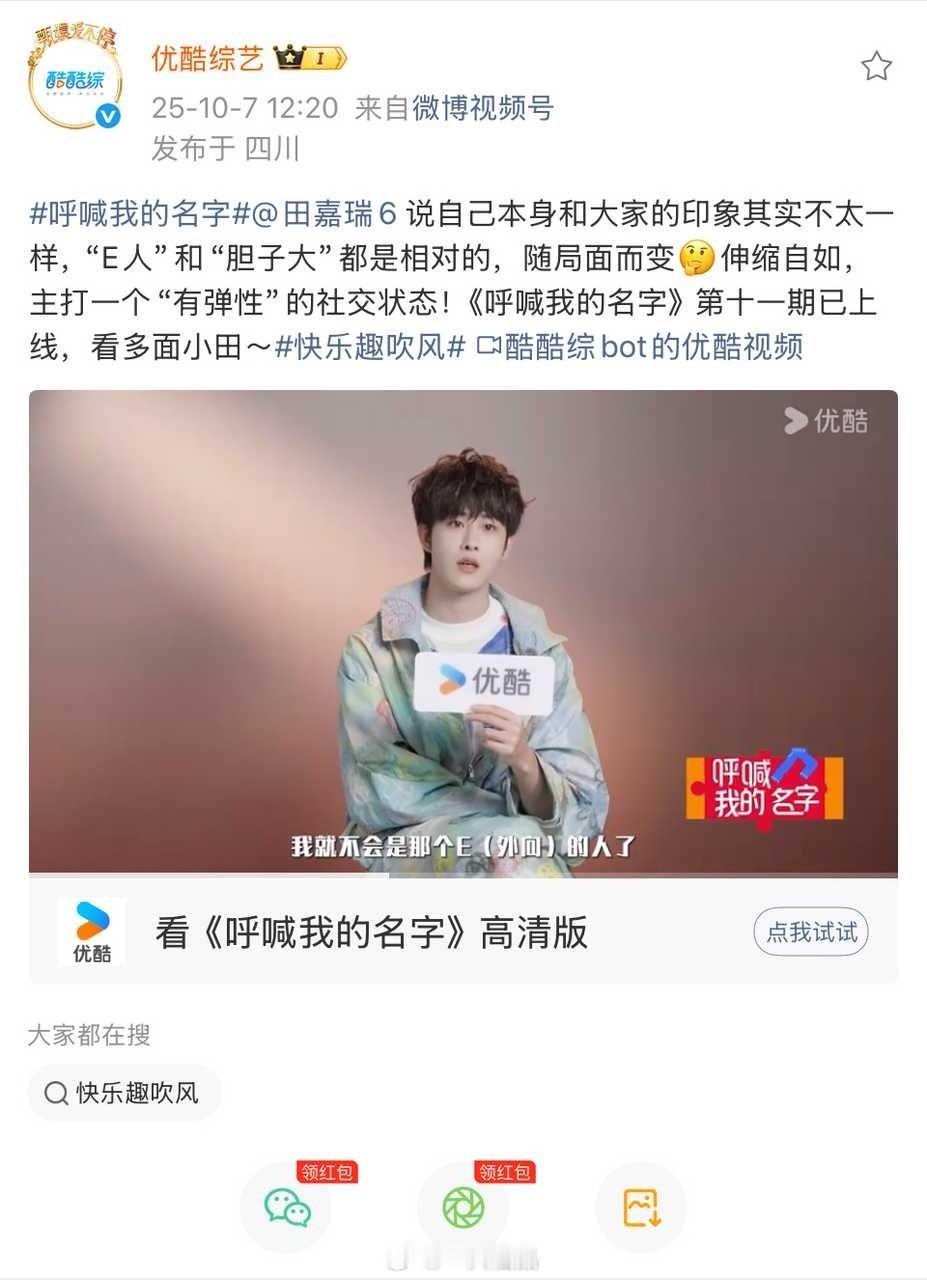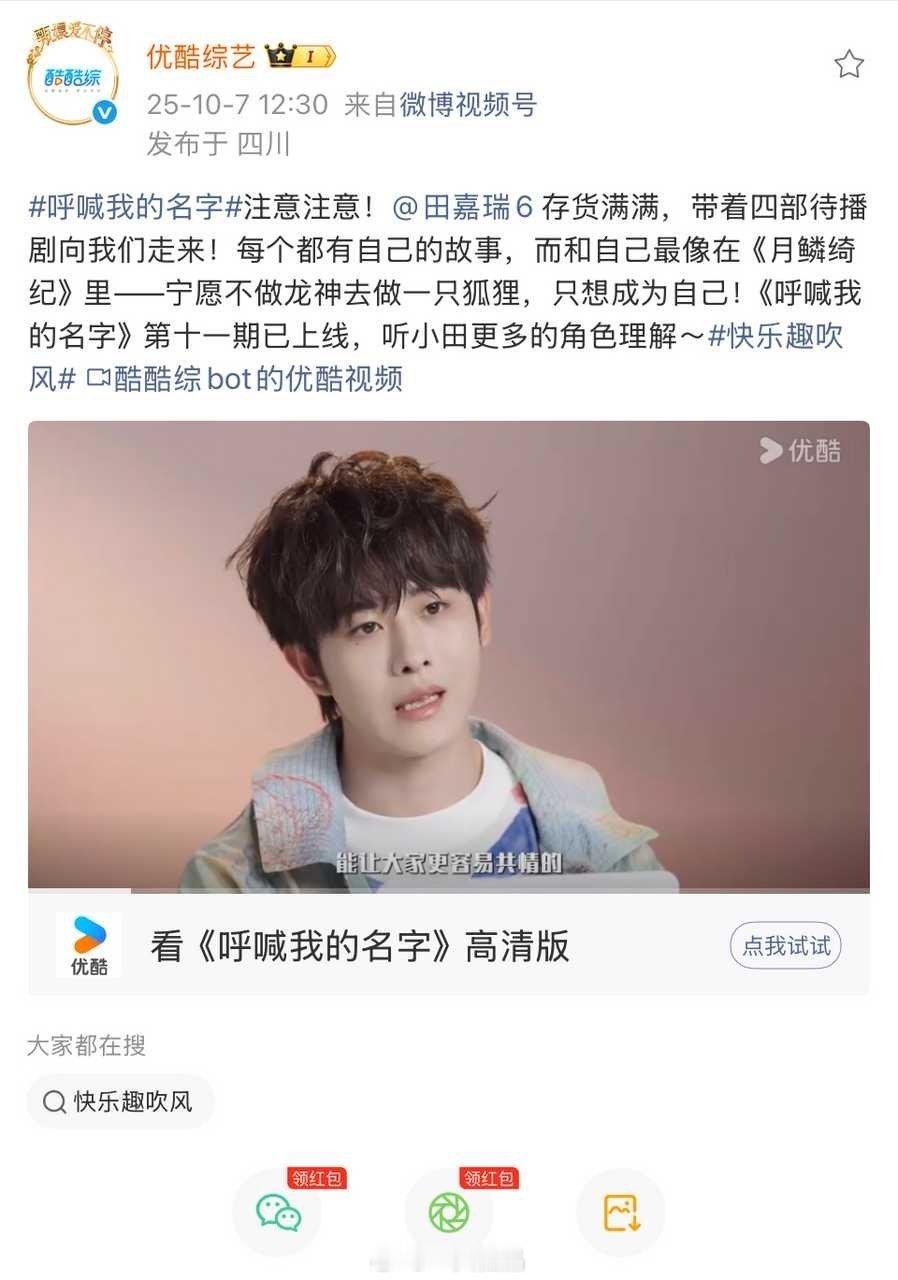 优酷昨天连发十几条田嘉瑞,👖真的好宠好宠呀,田嘉瑞的综艺效果非常棒,大家都期待