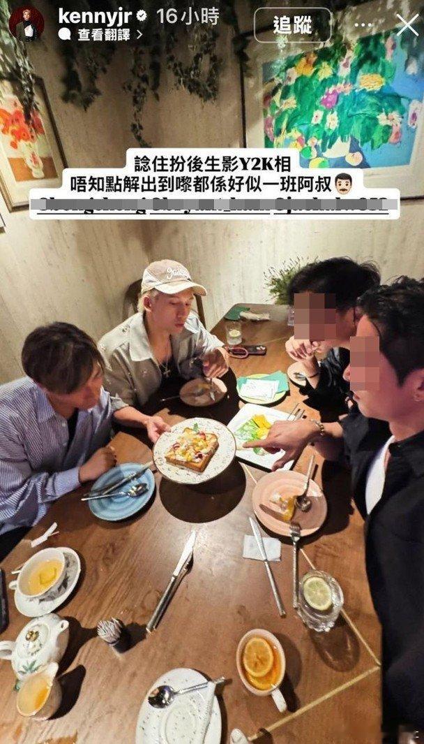 另外,Kenny在社交網分享飯敍照,搞笑說:「諗住扮後生影Y2K相,唔知點解出到嚟都係好似一班阿叔。」