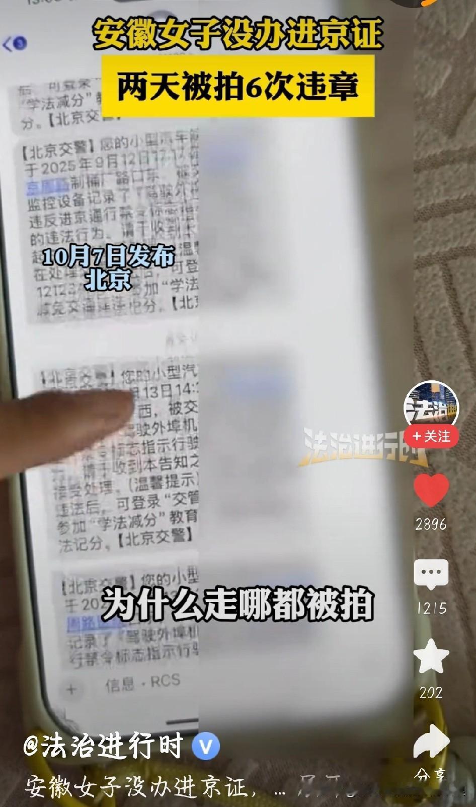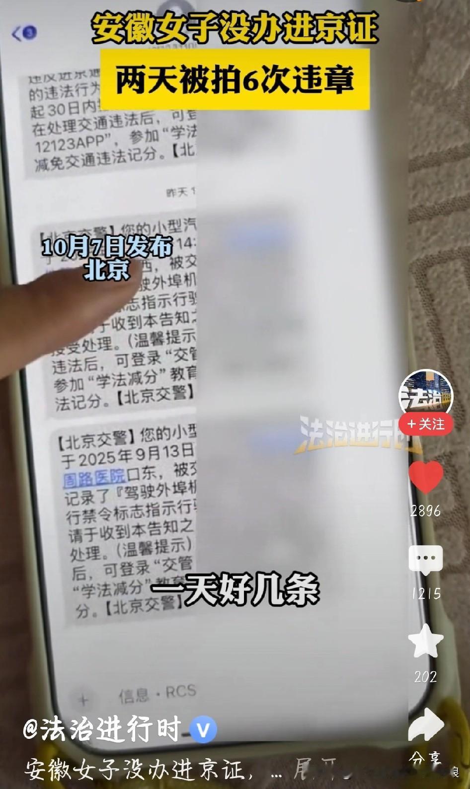 安徽一女子没办进京证,在北京两天被拍6次违章,网友看了都替她肉疼。 别觉得是罚重了,规矩早写得明明白白:没办进京证进六环内,拍一次就罚100块、记1分,而且每超4小时再拍还得罚。她这6次,600块和6分就没了。 有人说咋不提醒?现在办进京证特简单,手机下个“北京交警”APP就能弄,提前1-4天就能申请[。显然是自己没当回事。 外地车进京这根弦必须绷紧,别等违章短信来了才后悔。规矩就在那,谁碰谁吃亏!女子没办进京证2天被拍6次违章 外地车进京证 北京6环辅路需要办进京证吗 进京证每年最多12次 图片截图于网络
