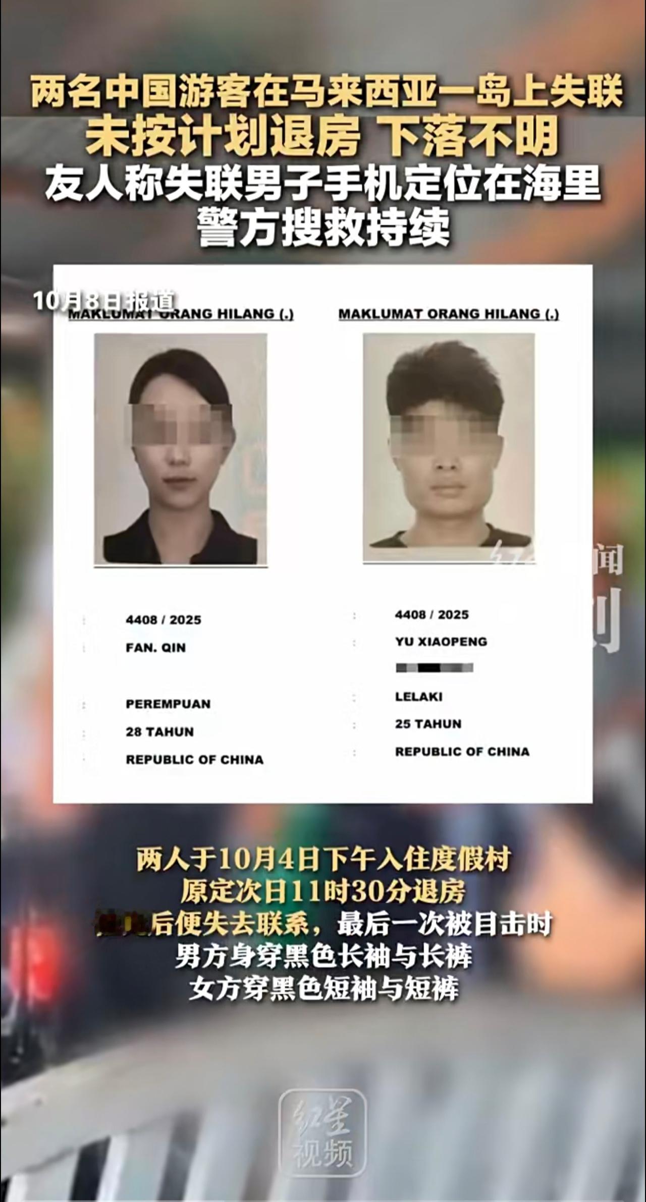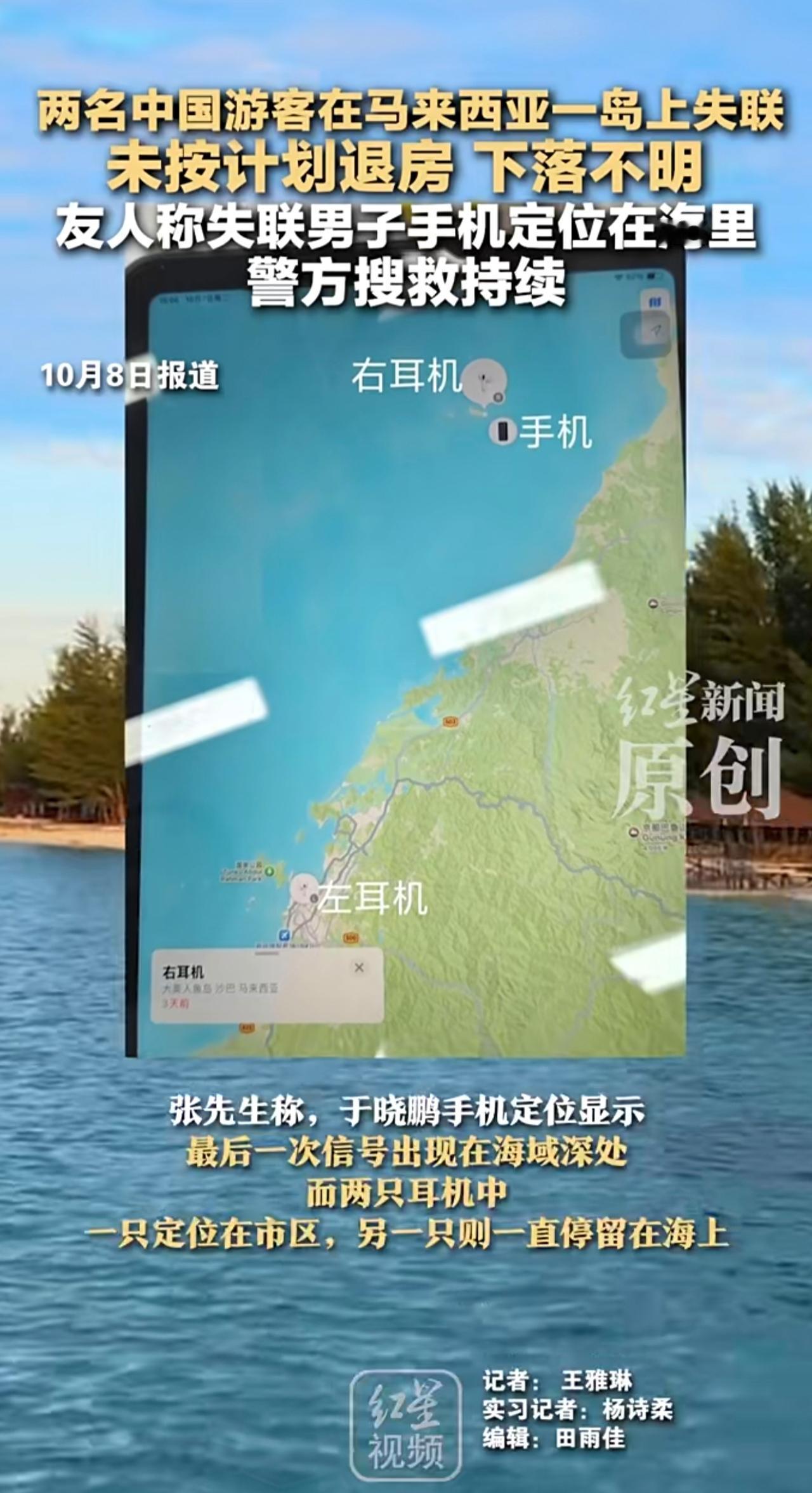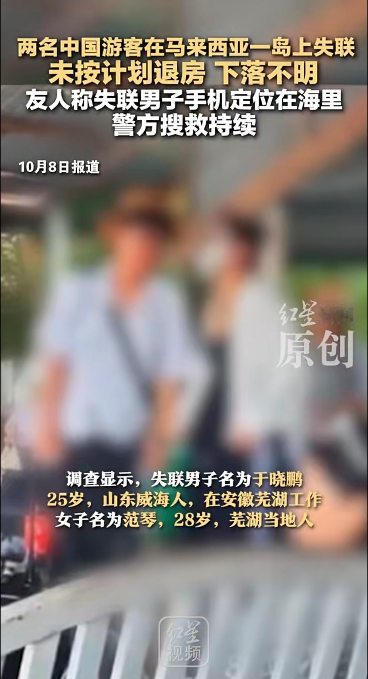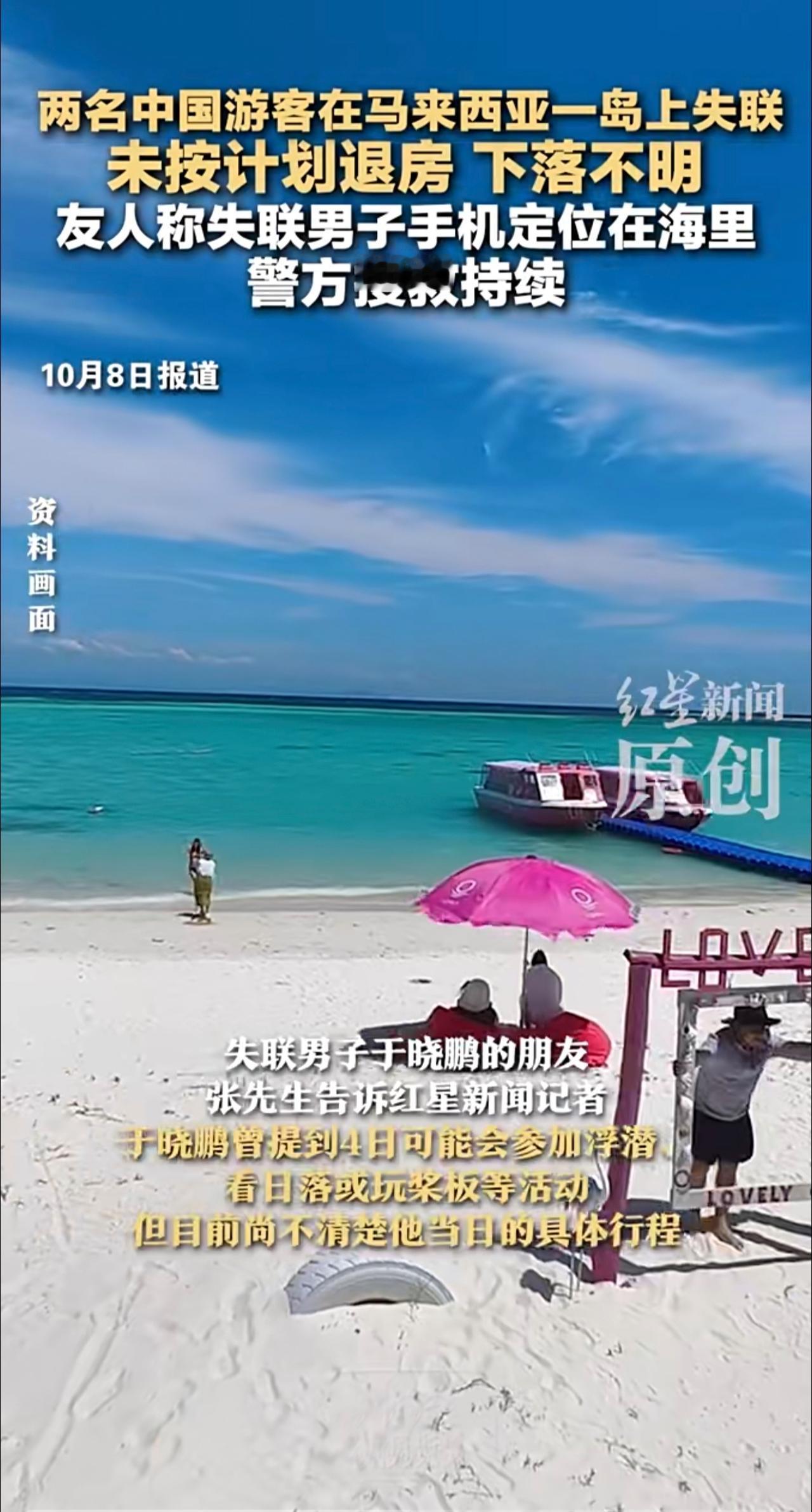两名中国游客在马来西亚一岛上失联 未按计划退房下落不明 友人称失联男子手机定位在海里 警方:搜救持续