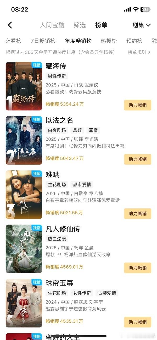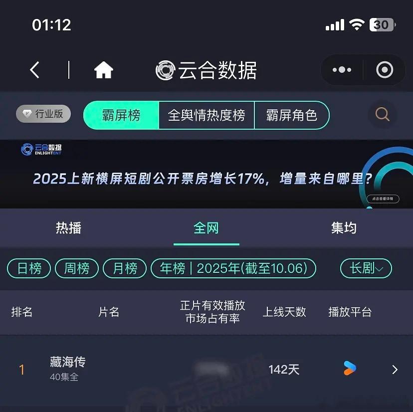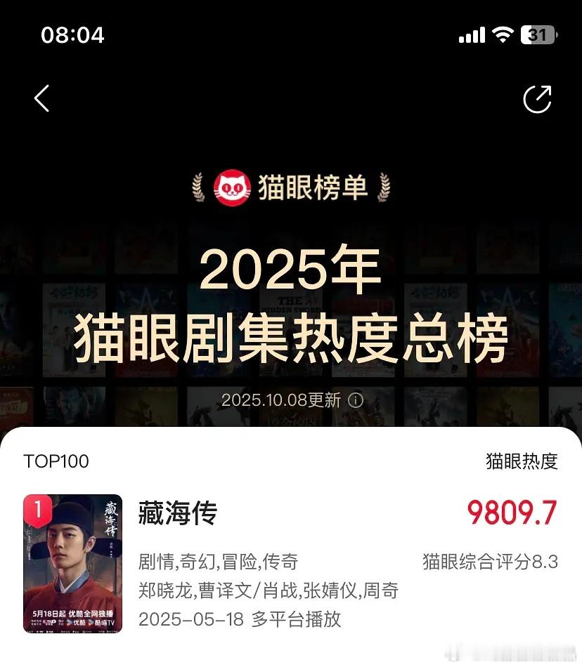 藏海传猫眼热度总榜暂2025年第一☝️,有效总播放量暂2025年第一☝️!同时云合,灯塔总播放量也是暂2025年榜第一☝️