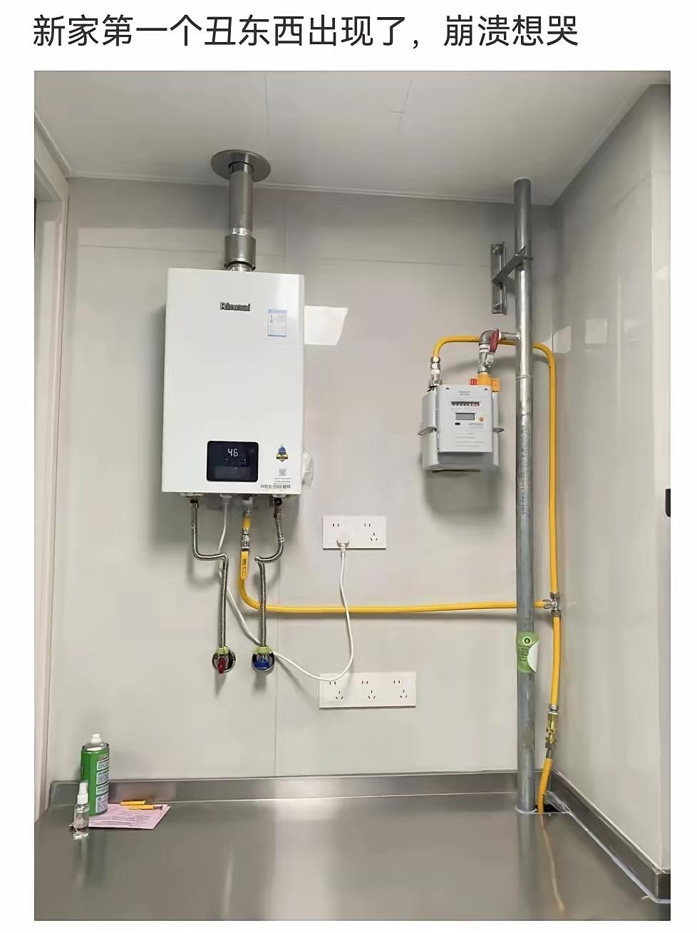 新家第一个“丑东西”出现了, 崩溃想哭…… 你们都是怎么处理的? 网友们表示 天燃气管道不是在外墙,怎么会在内墙,你这是封阳台吧,而且天然气管道必须刷黄漆以示区分。还有,你的根据图片比例,热水器有1米多高吧。50L 的容量吧?确认 AI 图 气表出口装F型三通,一个走顶,到热水器旁边紧贴下来接热水器;一个往下走进燃气灶。气表做百叶窗吊柜,下边用可拆卸柜板包住管道 燃气表出来的燃气管直接进橱柜里面,然后三通分,从热水器下方开孔出来连热水器。燃气立管找全屋定制搞几个板子一包,按现在燃气的安装规范,燃气表要露出来。 的确很丑,一般煤气表都是装在橱柜台面下的。还有这个煤气的三通为什么要装到墙上去,不应该装在煤气表出口吗。 这只能做个柜子藏起来,眼不见为净,天然气管道又不让封包,只能用柜子,舍弃这个空间 大家怎么看呢