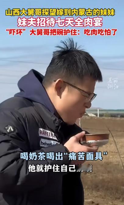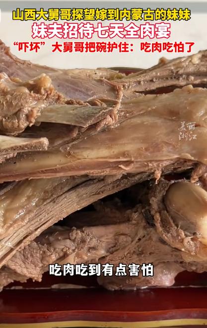 内蒙古赤峰,一男子趁着假期来看望远嫁的妹妹,没想到,从到了地方开始,就受到妹夫的硬核招待,七天时间里顿顿都是肉,几天下来,这位大舅哥看到肉都连连摇头。网友:估计下次不敢来了 事情的起因是汪先生(化名)好久都没有见过妹妹了很是想念,于是就趁着假期开车去了内蒙看望妹妹,顺便在沿途旅游一下。 妹妹听到汪先生要来的时候很是开心,随后等汪先生到了之后,妹夫顿顿都会热情的款待他,每一顿必不可少的就是烤羊排,前两天的时候,汪先生吃着爆汁的羊排很是爽,觉得太香了。 可到了第三天,他的胃终于撑不住了,顿顿大肉,连汤都是油花,他这辈子都没吃过这么重的口。 习惯了清淡和面食的他,开始感到反胃、头晕、没劲,但又不好意思说出口。 那头的妹夫还一股劲的给他说让他再来点,这是最好的部位,在妹夫看来,多吃点才是尊重,多招待点才算真诚。 于是那块肉又被递到了汪先生的面前,他只能赶紧伸手,挡住碗口,连连摇头说“够了够了”。 妹妹在一旁看着一直哈哈大笑,因为她知道哥哥不是拒绝,而是被这份热情“喂”到顶点的无奈。 很快这件事情被网友们刷到了之后,有人在下面分享着自己的经历,说在他小的时候,奶奶、妈妈总怕他饿,饭桌上一个劲往碗里夹菜,不管我们怎么说“够了”,还是不停地添。 那种笨拙的关心虽然让人吃得难受,却藏着最真诚的爱。 还有一些网友在下面调侃说,她自己特别爱吃肉,所以以后也要找一个内蒙的对象,过过肉瘾。 其实对远嫁的妹妹来说,娘家人的来访多少有点试探的意味,看看女儿在婆家是否被重视,妹夫把最好的菜全端上桌,不让客人一点委屈,就是在用行动回答,她在我们家过得很好。 其实吃什么并不重要,关键是那份“想让你好”的心,内蒙人用肉传达真诚,不同的食物,装的都是同样的温度,家人的惦记。 那只伸手盖碗的动作,看似小,却成了最真实的亲情印记,多年后回想起来,这一幕,一定会让兄妹都忍不住笑出声。 对此,你还有什么看法呢? (信息来源 :美丽浙江 2025-10-07)