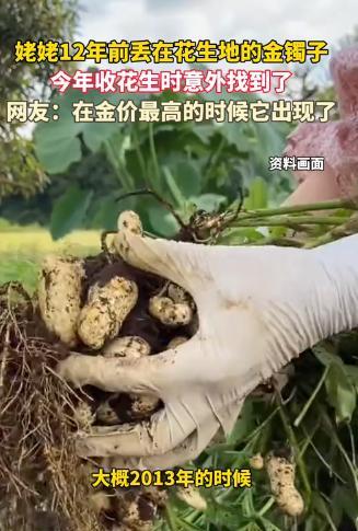 河北一女子在地里收花生时,竟然发现了一个金镯子,本以为是假的,可是问家里人之后,才发现这是真的,原来,她姥姥在12年前,就是在这片花生地里丢了一个金镯子,有30多克,按照黄金回收价格850元算,差不多是3万块钱了,女子直呼:“今年花生太值钱了。” “当”的一声脆响,锄头尖撞上了硬东西,震得王丽手腕发麻。 10月5日下午,在河北邢台巨鹿县的花生地里,32岁的王丽正跟着表哥收花生。 本以为是撞到了碎石块,她弯腰扒开湿泥,一抹金灿灿的光泽突然从土缝里透出来。 那竟是一只裹着泥土的金手镯。 这只突然出现的金镯,不是凭空“长”出来的。 王丽拿着镯子飞奔回家时,78岁的姥姥戴上老花镜一瞧,手指立刻开始颤抖,是它!是你姥爷当年给我打的那只! 这一声惊呼,把全家人的记忆拉回了2013年的秋天。 2013年秋收,姥姥还能下地干活,每天都戴着那只千足金手镯去花生地帮忙。 那镯子是1968年姥爷用大半年工资打的,32克重,片状圆形的样式,跟着姥姥走过了四十多个春秋。 睡觉都舍不得摘,总说这是你姥爷给她的念想。 王丽回忆,当年收完花生,姥姥发现手腕空了,脸一下子白了。 全家人立刻返回地里找镯子,王丽的父亲用手扒开每一行花生秧下的泥土,母亲蹲在地上捏碎一个个花生壳,连田埂边的草棵子都没放过。 可巨鹿的沙质土壤疏松,刚掉落的金镯很快被浮土盖住,翻找了整整三天,连影子都没见着。 最后姥姥红着眼眶摆手,别找了,许是跟这镯子的缘分尽了。 那天晚上,王丽看见姥姥对着姥爷的遗像坐了半宿,眼里的光都暗了。 往后的12年里,这片花生地没荒过,先是王丽家种,后来交给表哥打理,年年轮种花生、玉米和大豆。 每年翻地都忍不住多瞅几眼,可哪想到它藏得这么深。 表哥说,他用的还是老式锄头,那天要是力道轻一点,说不定就错过了。 王丽把镯子拿到镇上的金店清洗时,师傅表示,这镯子就是变形了,金的本色一点没变,你看这纹路还清晰着呢。 而更关键的是,这片地始终有人耕种,每年的翻土作业相当于在“被动寻找”,若是盖了房子或荒置,镯子恐怕真要永埋地下了。 如今这只镯子的价值早已今非昔比。 2013年国内足金价格约300元/克,如今受全球央行购金潮影响,2025年9月国内交易所金价已涨到854元/克。 算下来,这只镯子的市价从当年的9600元变成了27328元,12年涨了17728元。 但在姥姥眼里,这点增值根本不算什么。 她把镯子重新戴回手腕,尺寸刚好贴合如今布满皱纹的手,摩挲着上面的花纹念叨,你姥爷要是知道,肯定也高兴。 这件事传到网上后,网友们的讨论炸开了锅。 有人调侃“种花生得金镯,今年这地的产值拉满了”,更多人却被表哥的举动打动,没人看见还主动送回来,这人品比金镯值钱。 珍贵的东西从不会真正消失,有的靠自然守护,有的靠人心惦记。 12年里,花生收了一茬又一茬,姥爷走了,姥姥老了,可这只镯子带着当年的温度回来了。 而这份失而复得的感动,远比黄金本身更值得珍藏。 信息来源:杭州网2025-10-07发布视频
