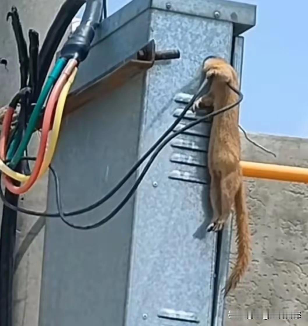 这个小动物应该是被电住了,在这地方活动,到处都是电,小动物哪里知道电的厉害,一不小心就容易被电住,画面中的这个小动物,有人说是黄鼠狼,看颜色倒是有些像,但是看这东西的尾巴,好像又不像是黄鼠狼,我觉得黄鼠狼的尾巴应该比这个小动物的尾巴要大一些,而且毛也非常的长,毛管看起来也特别的亮,初步判断,这东西很可能是一只猫!