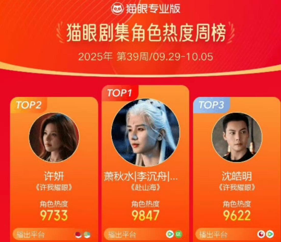 猫眼专业认证成毅赴山海集均有效播放九月TOP1,剧集角色热度周榜TOP1!成
