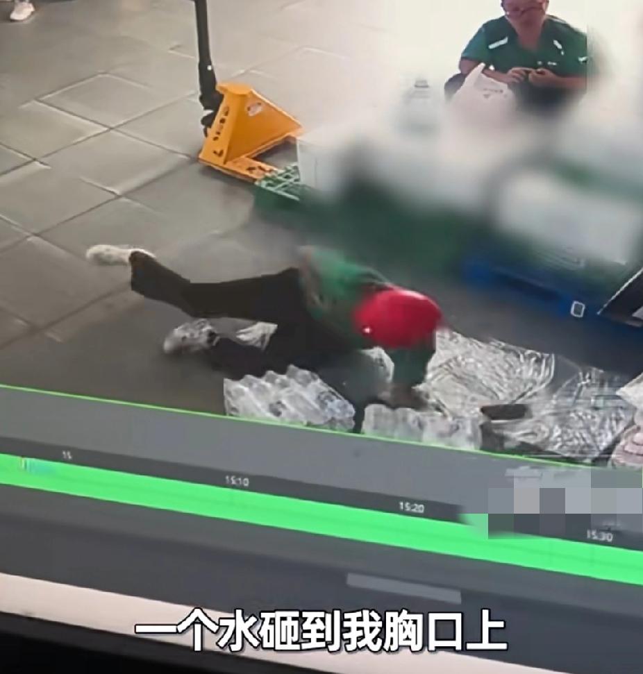 10月5日,上海一小伙躺在地板上睡了十分钟,就被从两大包矿泉水从一米多高的地方掉