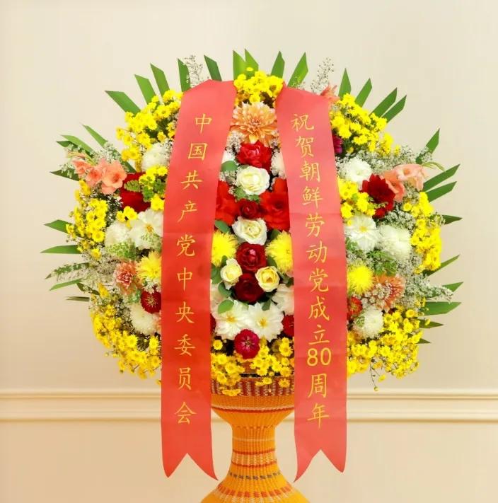 在朝鲜劳动党成立 80 周年之际,中国共产党中央委员会和中国驻朝鲜大使馆向朝鲜劳动党中央委员会赠送了花篮。