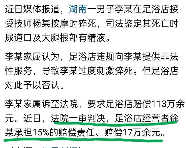 湖南的这家足浴店的故事,比短剧里的情节还离奇!李某接受该足浴店的杨技师按摩时猝死了!司法鉴定其存在遗传物质泄露,家属质疑足浴店提供了非法的X服务,于是索赔113万元!法院判决足浴店承担15%的责任,赔偿家属17万元! 根据新闻报道内容,没证据证明足浴店提供X服务,法院判赔17万可能是施救不及时,经营啥都有风险啊! 技师杨某没责任,说明不是按到了要害部位造成的! 乍一看到这个新闻,还以为小伙子李某口嗨自大,像乔杉和大鹏捏脚时那么嘴硬,让捏脚的技师猛攻他的肾脏反射区,结果乔杉吐了白沫!
