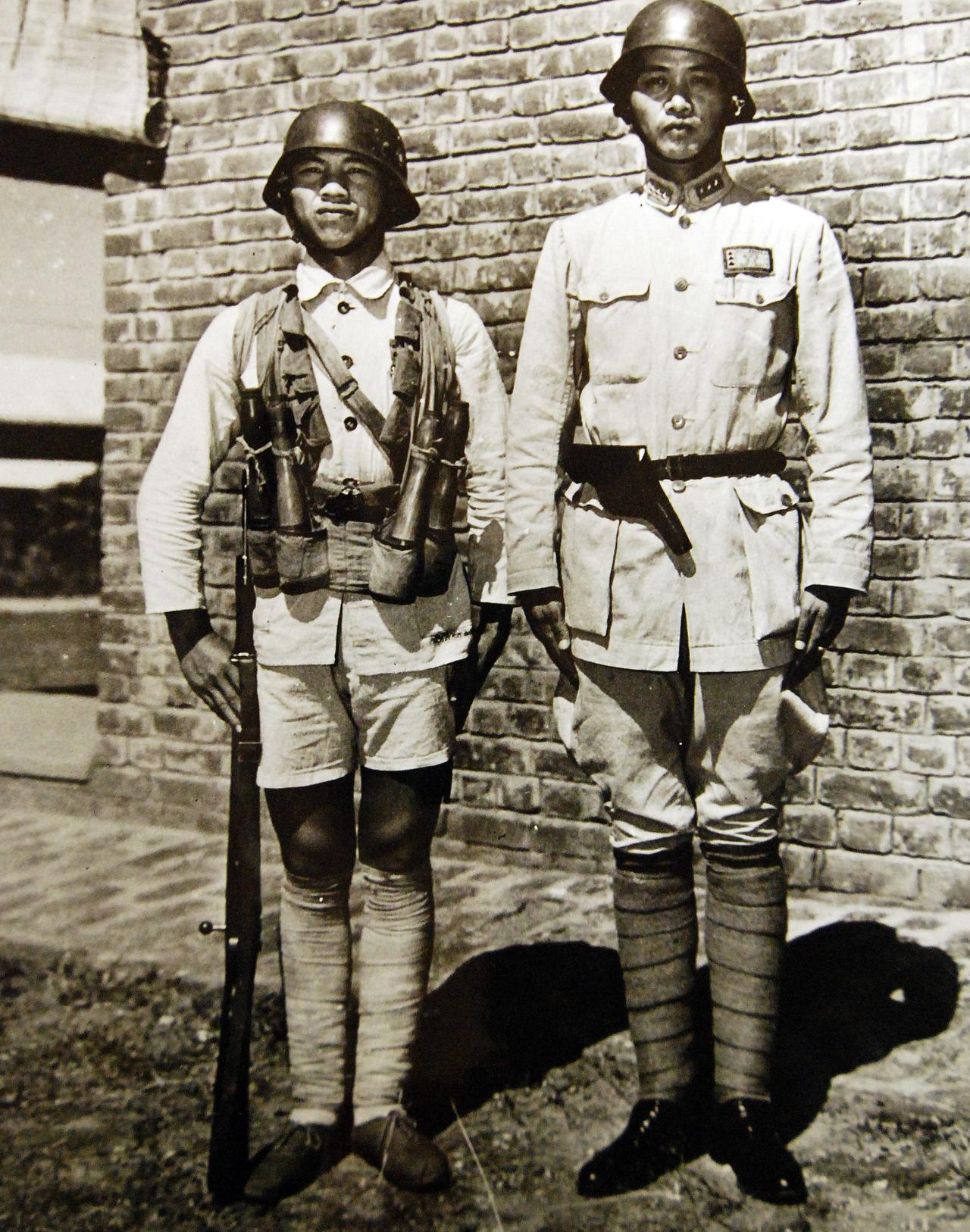 1942年1月,第三次长沙会战期间。砖石墙前,两名中国军人的身影鲜明如战时印记:左侧士兵穿野战服,短裤配紧扎的绑腿,深棕色弹袋斜挎胸前,钢盔下藏着青年士兵的刚毅;右侧军官着制式军装,衣襟笔挺,臂章、领章隐现身份,腰间皮带与锃亮黑鞋,衬出装备的规整。
