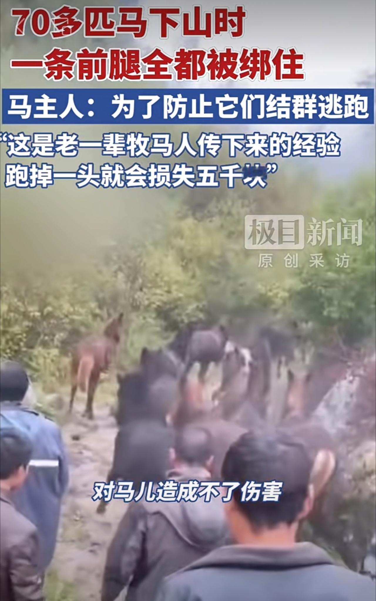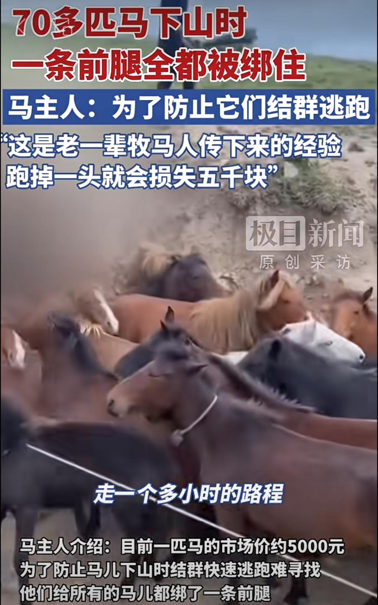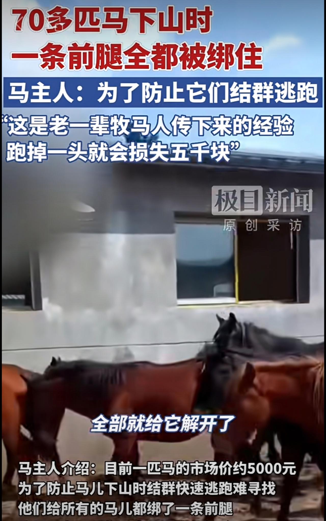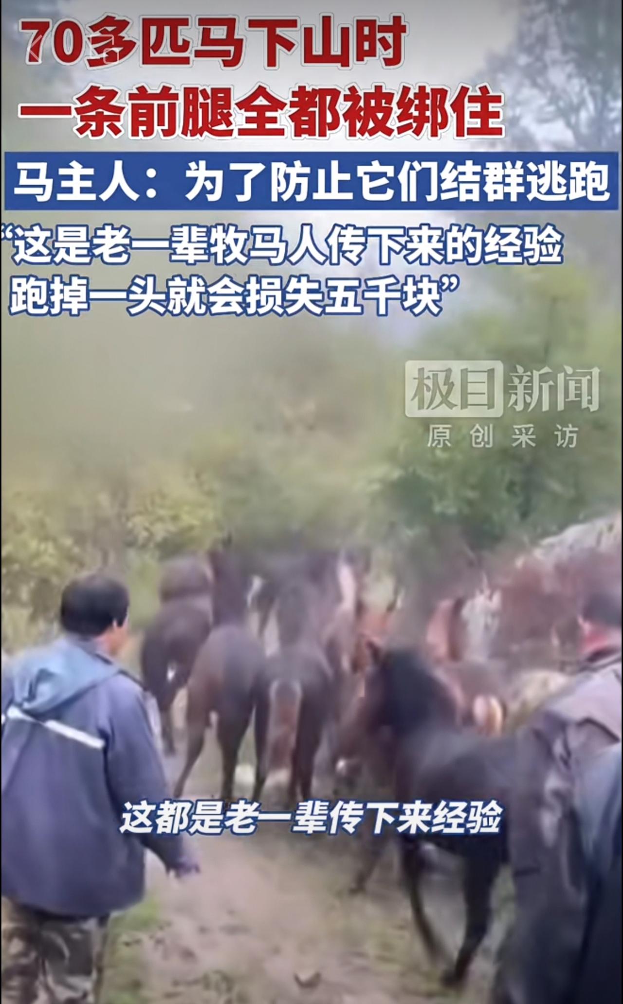 70多匹马下山时被绑一条前腿,马主回应:防止它们结群逃跑,损失一头就是5000元(来源:极目新闻) 一审:苏含雪 二审:黄美清 三审:欧阳可及 陈雄标