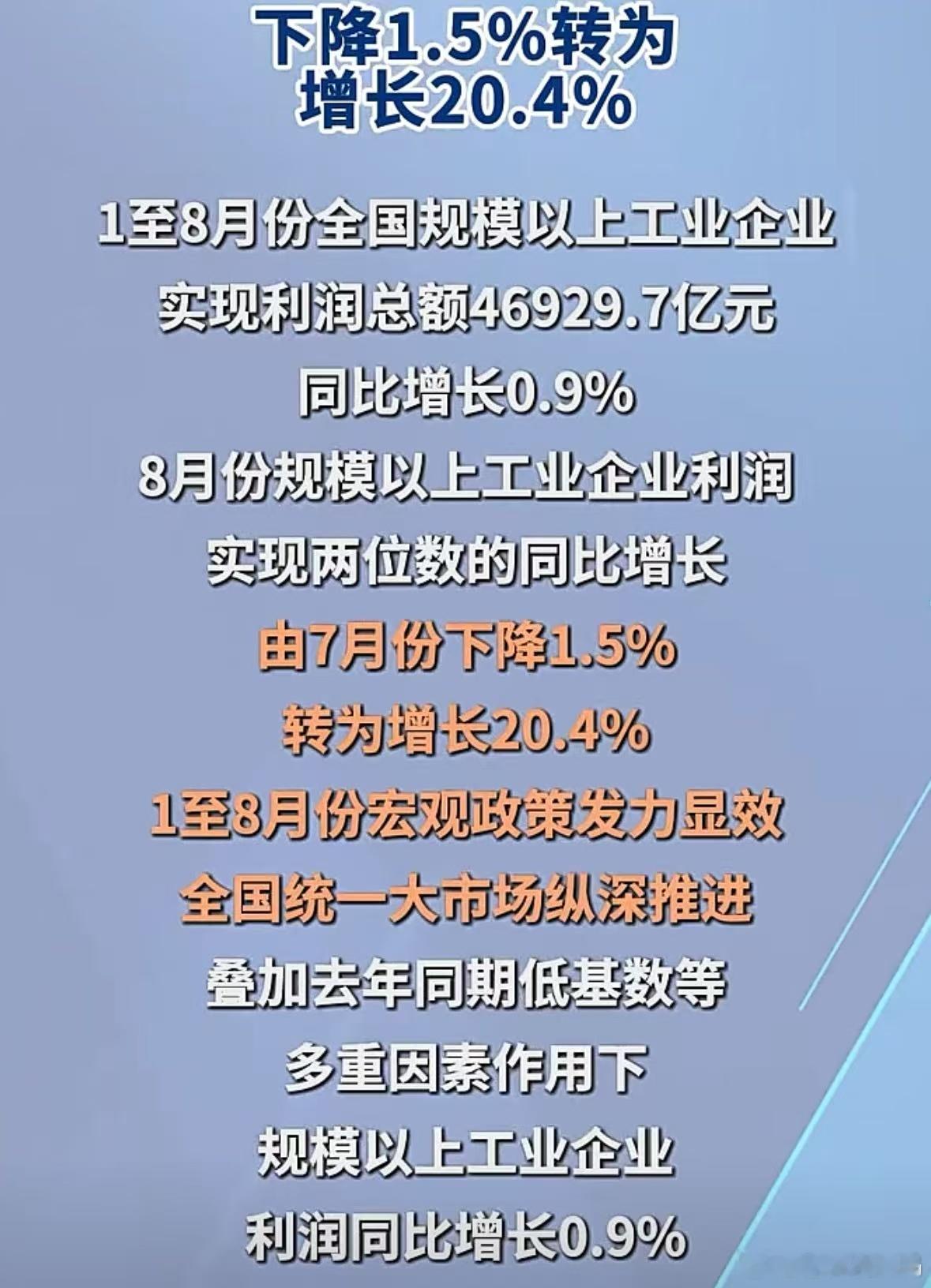 反内卷果然管用了。国家统计局的新数据,1—8月份,规模以上工业企业利润由1—7月