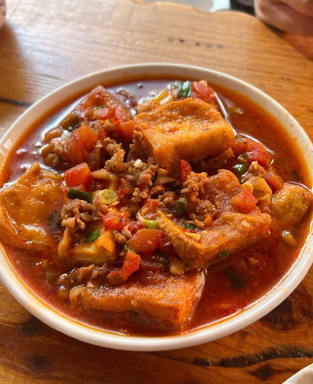 4️⃣.包浆豆腐,煎制得金黄的豆腐,搭配西红柿肉沫,一起焖,酸辣下饭