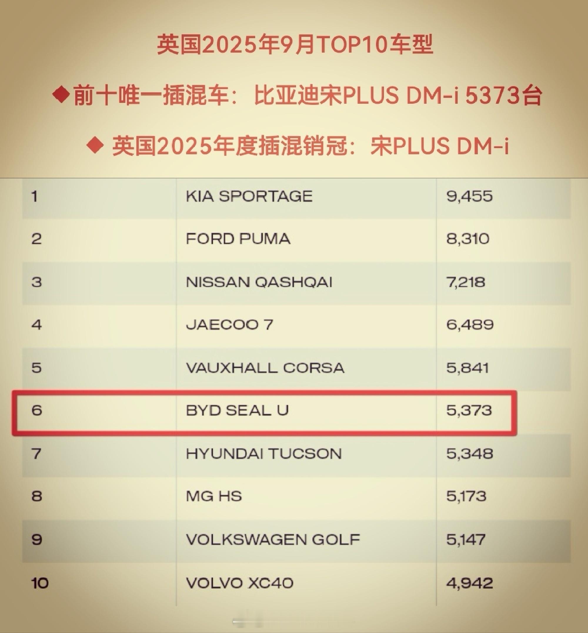 仅这一款车型就卖出5373台,不仅在英国整体汽车市场销量榜上名列第六,更成为英国插电混动市场的销冠。