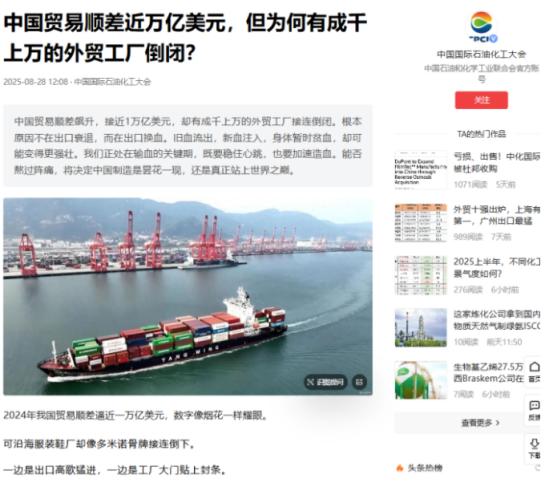 为什么中国的贸易顺差已经接近1万亿美元了,但外贸企业却还一批又一批地倒闭?这么说吧,大量外贸企业倒闭,实际上正是我们正在把西方的工业挤出市场的证明。   这么说吧,中国贸易顺差都快摸到1万亿美元了,这数听着确实吓人。按常理,外贸行当该一片热火朝天,工厂机器得24小时连轴转,订单排到半年后才合理。   可现实压根不是这么回事。打开新闻总能刷到外贸企业倒闭的消息。有的工厂门口堆着一堆没发走的货,风吹日晒的。有的老板愁眉苦脸地清库存,连工人工资都快发不出。   工人失业的传闻也时不时冒出来,看着就揪心。很多人想不通这反差,其实这背后藏着外贸格局的大换血,大量企业倒闭,恰恰是我们把西方传统工业挤出市场的必经之路。   顺差的大头早不是那些老本行撑起来的了。新能源汽车、光伏组件、锂电池这些“新三样”正在攻城略地。2025年前八个月,光这三样的出口增幅就撑起了外贸增长的半壁江山,它们单价高、附加值足,随便一单的利润就能抵得上过去几十单服装的收益。   可这些新兴产业的爆发,跟那些做了十几年纺织品、玩具、低端电子元件的工厂没半毛钱关系。传统外贸企业的日子早就不好过了。   美国抡起的关税大棒成了压垮很多企业的最后一根稻草。特朗普政府搞的所谓“对等关税”一路飙升,现在不少品类的税率都超过了100%。对外经贸大学的屠新泉教授说得直白,关税一旦超过50%,正常商业贸易就很难开展了。   安徽有家生产尼龙扎带的企业,货都装箱了,就等着发往美国。关税突然暴涨,这单生意直接黄了,老板只能紧急找其他市场的客户。这种情况在广东汕头的纺织圈里更常见,不少厂子靠着美国市场活了十几年,现在订单直接砍半。   更要命的是关税政策没个准头,今天说加征明天说暂缓,企业根本没法做长远规划。河北有家做保温材料的公司,本来谈好了一笔4年期的美国订单。客户一算关税成本,直接把合同搁下了,连带着周边配套产品的订单都受了影响。   订单本身也变了味。过去那种几百上千件的大单子越来越少,取而代之的是几十件的小单、急单。这种碎片化订单对生产要求极高,得快速响应还得控制成本。   石狮有家服装企业早就搞了智能化改造,能实现“小单快反”,才扛住了冲击。可更多没来得及技改的工厂,小单生产效率低、成本高,做一单亏一单,不倒闭才怪。   成本上涨更是往这些企业伤口上撒盐。原材料价格一年能涨好几波,钢材、化纤这些基础材料的涨幅都快赶上利润了。人民币汇率这两年也不省心,虽然贬值预期在降温,但汇率波动带来的风险,小老板根本扛不住。   他们既没有大企业的汇率对冲工具,也没有议价权,客户一压价就得自己吞掉成本,利润空间早被挤成了纸片。   市场竞争也变得白热化。原来主攻美国市场的企业,订单丢了就转头抢欧洲、东盟的生意。这让本来深耕这些市场的企业瞬间压力倍增,不得不跟着降价抢单。   有做医疗设备的老板就吐槽,同行为了开工,简直是“赔本赚吆喝”,这种恶性竞争把整个行业的利润都拉低了。   更关键的是,我们的产业升级本身就会淘汰一批跟不上的企业。中国早就不是靠低价劳动力赚辛苦钱的阶段了。政策一直在引导企业往高端走,往高附加值领域靠。   那些只靠拼价格、没技术积累的工厂,被市场自然淘汰是早晚的事。这就像老款手机再便宜,也抵不过智能手机的普及,产业迭代必然会有阵痛。   但你看那些活下来的、还在扩张的企业,路子都走对了。深圳有家生物科技公司,早早布局东南亚、拉美市场,今年业绩反而涨了不少。   石狮的服装企业也聪明,把组装环节放到柬埔寨、孟加拉国,上游的纺纱、印染这些核心环节还留在国内,既避开了关税,又牢牢抓着产业链的命脉。   这些企业的增长,才是1万亿美元顺差的真正底气。它们正在用技术和产业链优势,把西方那些高不成低不就的制造业挤出市场。   美国原来的纺织、低端电子产业早就扛不住了。欧洲的一些传统制造业也在我们的产业升级面前节节败退。这种替代效应带来的顺差,背后必然是一批跟不上节奏的国内企业被淘汰。   所以说,贸易顺差和企业倒闭看似矛盾,实则是同一个进程的两面。顺差代表我们的外贸竞争力在升级,在全球市场抢下了更多高端份额。   企业倒闭则说明,旧的生产模式已经玩不转了,那些依赖低端市场、没有核心能力的玩家,正在被新的游戏规则淘汰。   这不是外贸不行了,而是外贸正在换血。把那些低效的、高耗能的、低利润的产能清出去,才能给新能源、高端制造这些更有前途的产业腾出空间。   等这场升级完成,中国外贸的根基只会更稳。那些抱怨生意难做的老板,要么主动求变搞升级,要么就得接受被市场淘汰的结局。   这就是产业升级的残酷真相,也是我们能在全球贸易中越来越有话语权的根本原因。   信源:证券时报《迎战三重考验 中国外贸人求变突围进行时》(2025年9月22日)