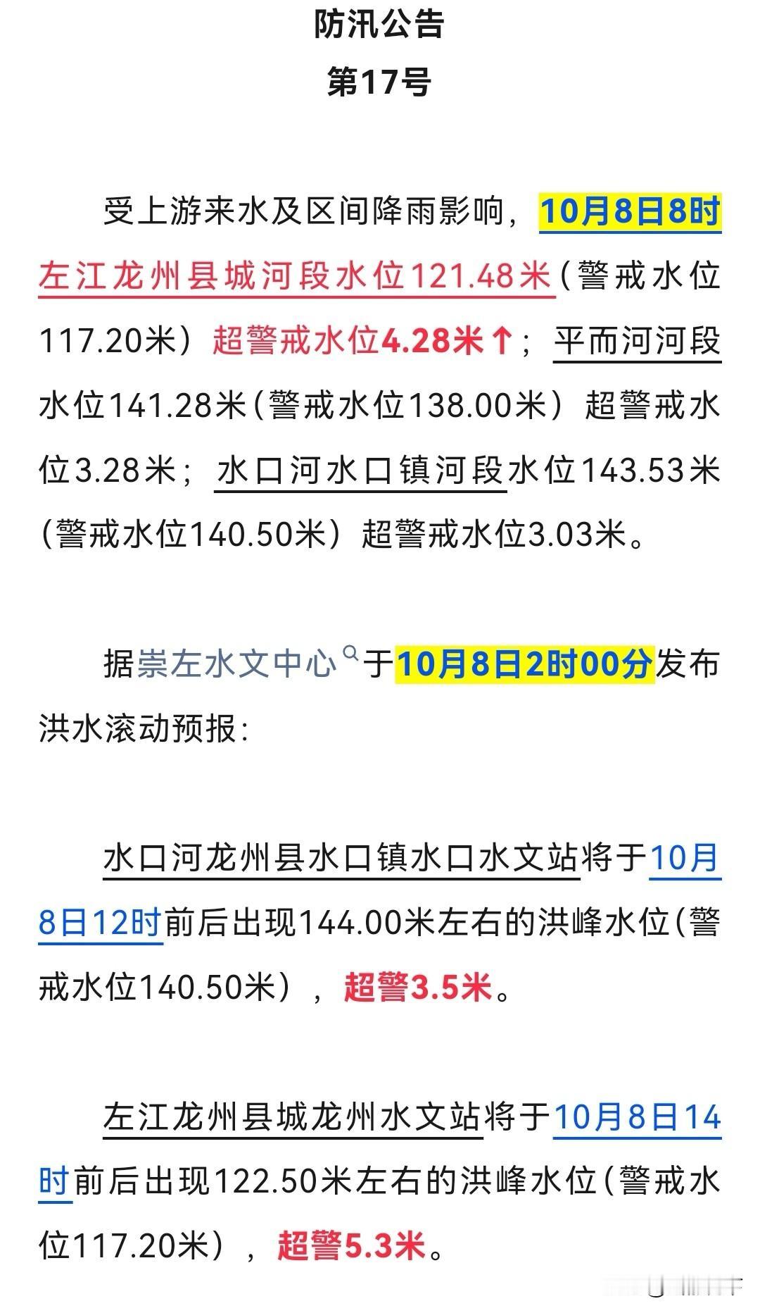 广西龙州县这个边境小城太难了,大家都在喜迎国庆的时候,龙州县一个星期被淹了两次,受台风“麦德姆”带来的强降雨及上游来水影响,水口河、左江水位持续快速上涨。 昨晚龙州县城低洼群众已经陆续撤离,龙州在经过上一轮汛情后,再一次投入到防汛救灾各项工作当中,据崇左水文中心于10月8日2时00分发布洪水滚动预报: 水口河龙州县水口镇水口水文站将于10月8日12时前后出现144.00米左右的洪峰水位(警戒水位140.50米),超警3.5米。 左江龙州县城龙州水文站将于10月8日14时前后出现122.50米左右的洪峰水位(警戒水位117.20米),超警5.3米。 愿龙州早日恢复过往的宁静与美好,龙州挺住