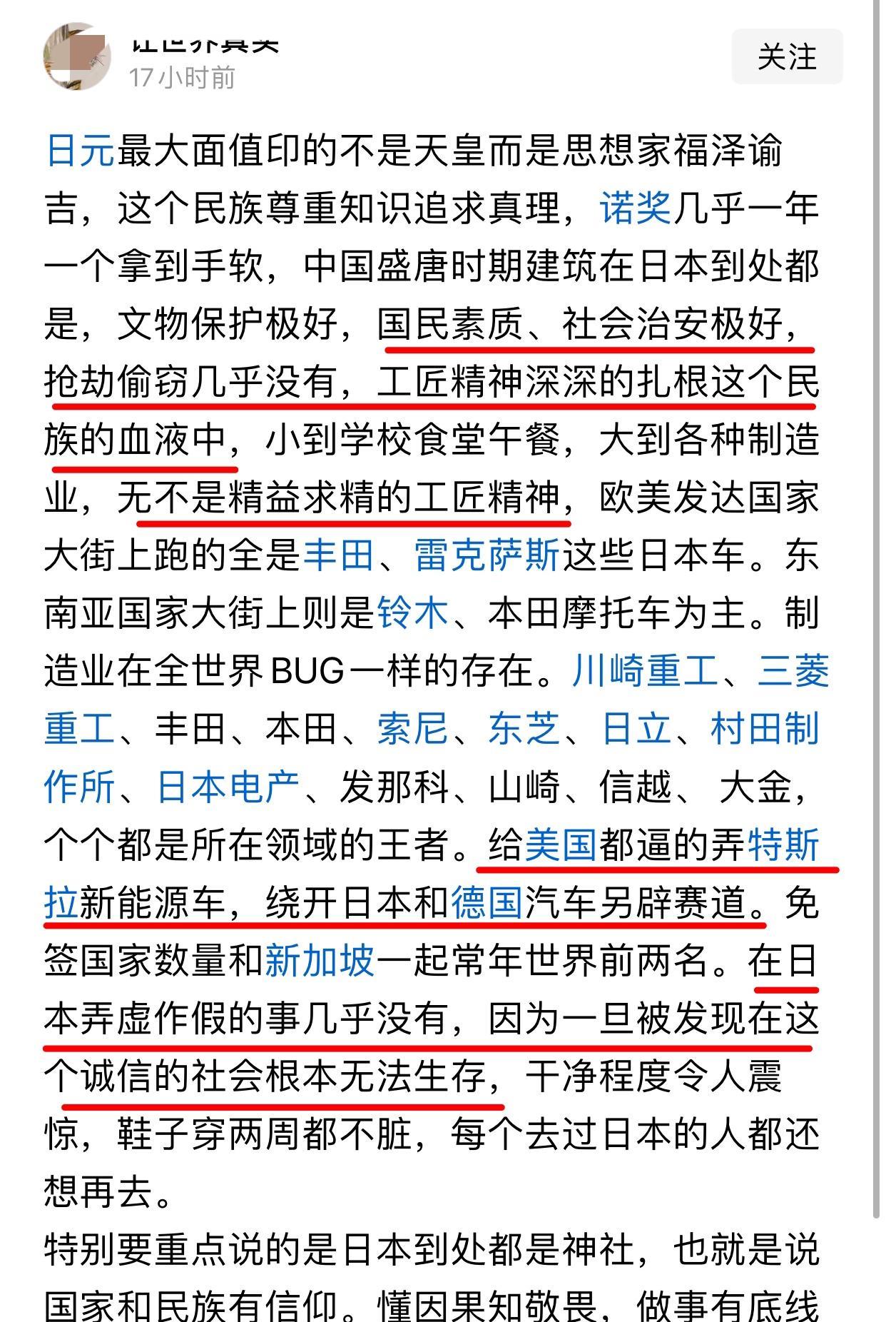 不夸张地说,这位北京ip的43岁大叔,是这次日本人获得诺贝尔奖之后,看到的最用心也是跪的最瓷实的日吹,从国民素质夸到工匠精神,从日本企业讲到诚信社会,连特斯拉的出现都不是马斯克的功劳而是出自被日本技术围困的无奈,这些年日本品牌造假鞠躬的事情是一个字不提。跪技术还好说,最后连神社都拿来吹,不知道靖国神社在他眼里是对什么的因果和敬畏。