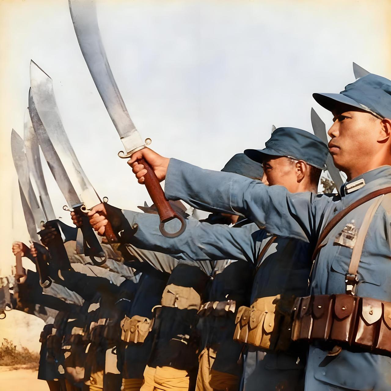 抗日时期,29军大刀队军容严整,身姿挺拔列成整齐队列,目光如炬,将大刀高举,刀锋映光直指侵略者,即将开赴前线。 他们曾战斗于喜峰口、卢沟桥、北平城、长城等地,以“破锋八刀”让大刀虎虎生风。日寇胆寒之下,给士兵配备铁围脖,却因装备笨重削弱灵活性,反致伤亡更重。