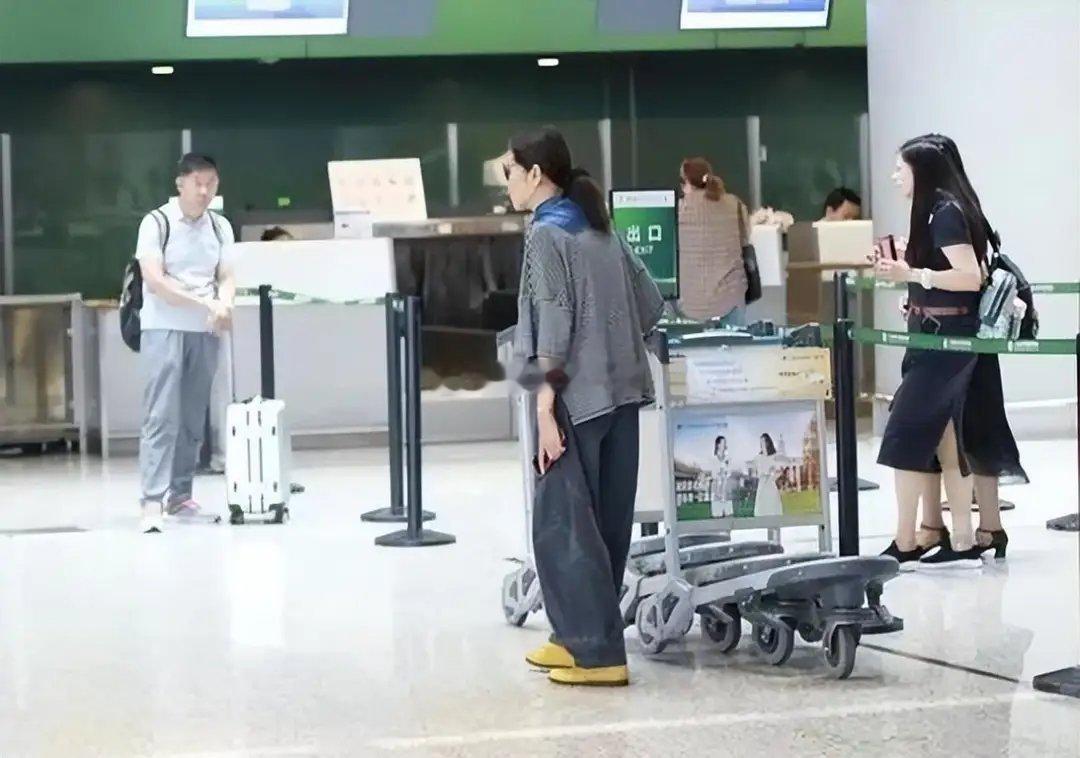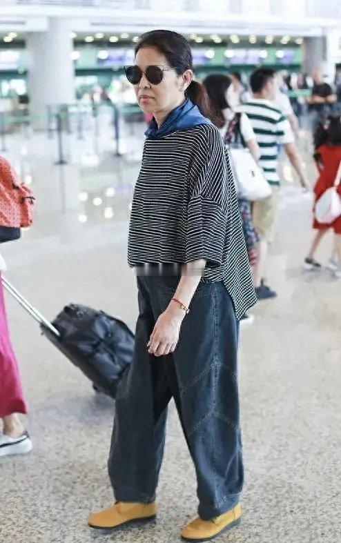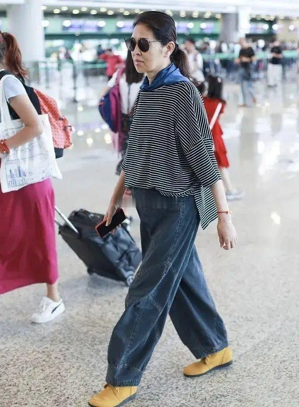 倪萍瘦身后真洋气,穿条纹T恤+阔腿裤走机场,戴猫咪墨镜不像66岁