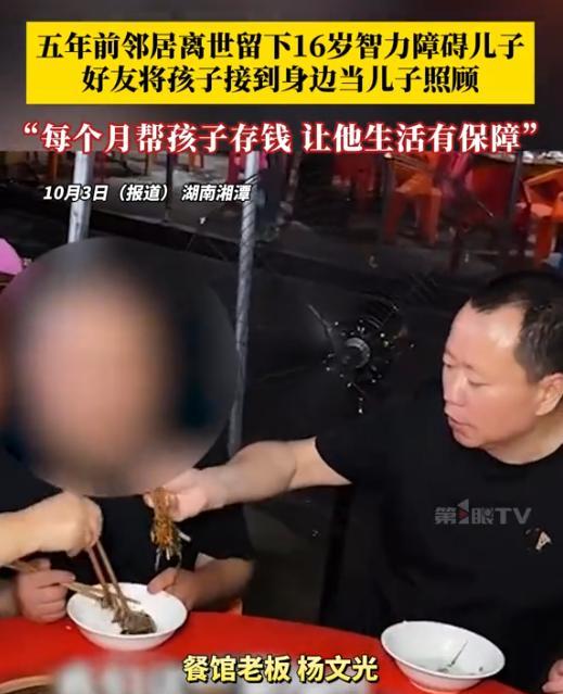 在湖南的一个普通家庭里,有一位名叫熊先生的父亲,他的人生道路走得特别艰难。熊先生的儿子从小就被诊断出有智力障碍,这给整个家庭蒙上了一层阴影。孩子的妈妈承受不了这种压力,最终选择离开家,只剩下熊先生一个人既当爹又当妈,硬撑着把儿子拉扯大。 可老天爷好像故意和熊先生过不去,在他五十岁出头的年纪,自己又被查出了治不好的重病。熊先生不怕自己走到生命尽头,最放不下的就是这个心智像小孩一样的儿子。 他整天愁啊,万一自己走了,儿子一个人可怎么活?谁给他饭吃?谁照顾他冷暖?一想到儿子将来可能受苦,熊先生心里就跟针扎似的疼。 琢磨来琢磨去,熊先生想到了从小一起长大的好邻居杨先生。两家是多年的老交情,感情比亲兄弟还亲。熊先生觉得,这世上除了自己,最能指望上的就是这位老兄弟了。 于是他把杨先生请到病床前,紧紧拉着对方的手,用尽力气说出自己的心愿——希望杨先生能在他走后帮忙照顾儿子。 杨先生看着病床上瘦得脱形的老兄弟,又瞅瞅旁边懵懵懂懂的孩子,鼻子一酸,当场就拍板答应下来,说只要自己有一口吃的,绝不会饿着孩子。 听了这话,熊先生脸上终于露出安心的表情,没多久就平静地走了。 杨先生是个说话算数的人,办完丧事就把孩子接回了自己家。刚来的时候,孩子怕生,整天缩在墙角不敢吭声。杨先生和媳妇半点不嫌弃,待他比亲生的还上心,天天陪他说话,带他认东西。 慢慢地,孩子眼神里有了光,也愿意和人亲近了。但杨先生想得长远,自己总有老的一天,得让孩子学点本事将来能自立。 于是他把孩子带到自家开的小饭馆,从穿衣服、洗脸这些最简单的教起。 洗碗切菜这些活儿对普通人不算啥,可对这孩子就像爬山那么难。杨先生从来不急眼,一遍遍示范,孩子做错就重来,做对了就摸摸头夸两句。 日子一天天过去,孩子居然真的学会了煮面条、收拾碗筷,见人还会笑着打招呼了。 一晃五年过去了,当初那个只会发呆的孩子现在能把自己收拾得利利索索,还能在饭馆搭把手。 杨先生又细心地给孩子攒了笔钱,加上政府给的补助,盘算着将来自己照顾不动的时候,孩子也能有依靠。 这份不是亲人胜似亲人的情谊,就像冬天里的炉火,暖了孩子的心,也暖了周围所有人的心。 杨先生用五年如一日的实际行动,让大家看到了什么叫真正的责任和担当。