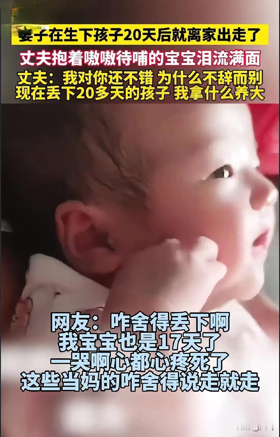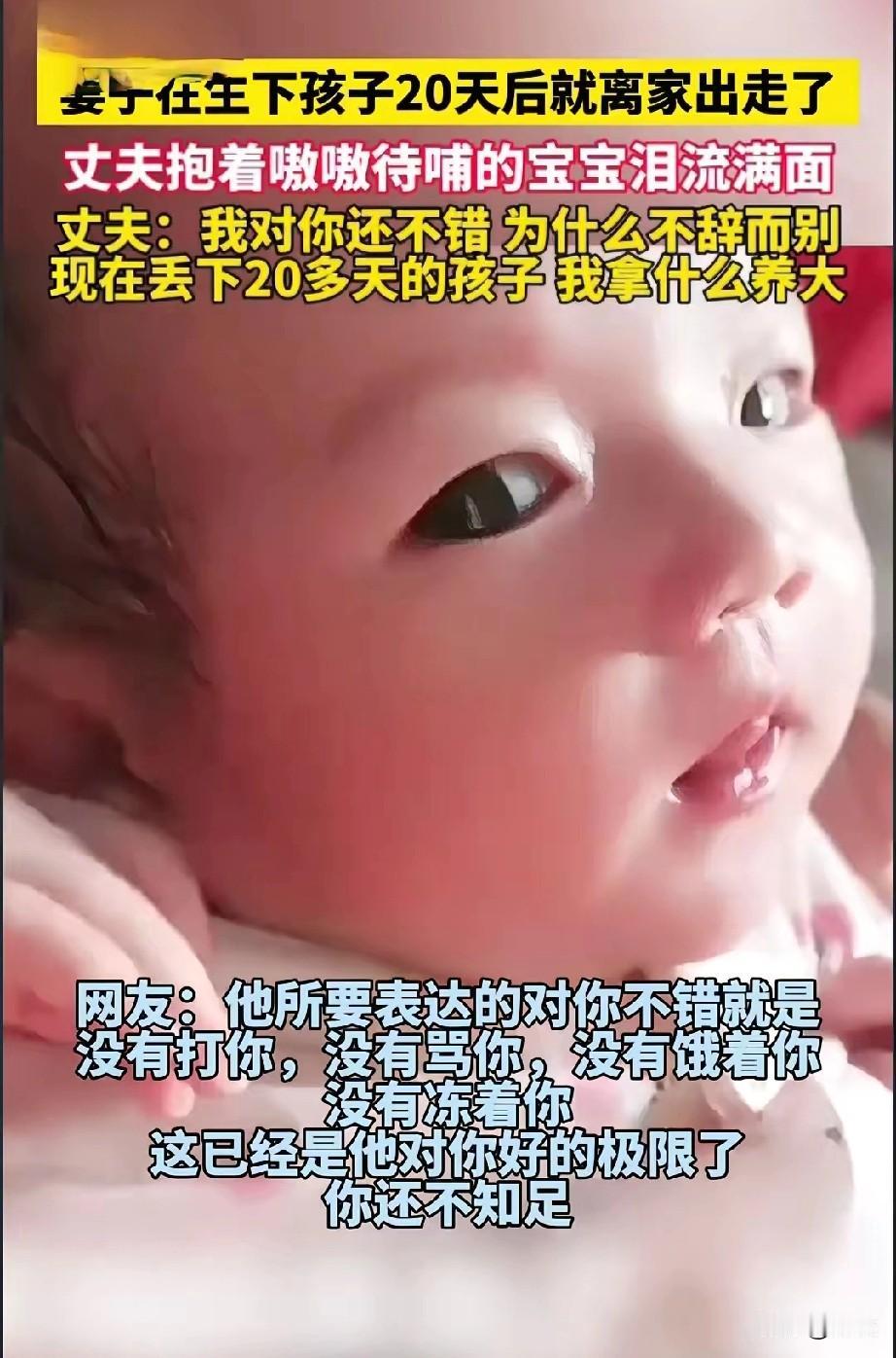 二十天前,这个家充满希望。二十天后,妻子却带走了所有温度。丈夫抱着襁褓中的婴儿,泪水砸在婴儿皱巴巴的脸颊上,声音嘶哑:“我对你还不错,为什么不辞而别?” “不错”是什么?是没饿着她,没冻着她,还是没动手打她?当婚姻的底线被误认为天花板,当“生存”被当作“生活”的馈赠,这样的关系,早已在沉默中千疮百孔。 网友的评论残酷却真实:“他对你不错,只是没有伤害你。”这像一把刀,剖开了多少婚姻的假象——有人用责任绑架情感,有人用忍耐替代沟通,最后却质问对方为何离开。可婚姻若只剩“不打不骂”的底线,与囚笼何异? 新生儿需要乳汁,但婚姻需要的是爱。爱是深夜喂奶时的一杯温水,是崩溃时的一个拥抱,是共同面对未来的勇气。若连这些都没有,责任便成了枷锁,将两个人困在名为“家庭”的牢笼里,彼此消耗。 我们总说“婚姻是柴米油盐”,却忘了柴米油盐里需要热气腾腾的温情。当一个人连灵魂都感到寒冷,离开或许是她最后的选择——不是不知足,而是终于明白:活着,和活着,从来不是一回事。