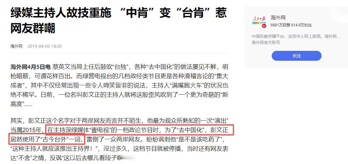 前绿媒主持人彭文正的态度发生转变,之前为“去中国化”,公开使用“古今台外”一词,