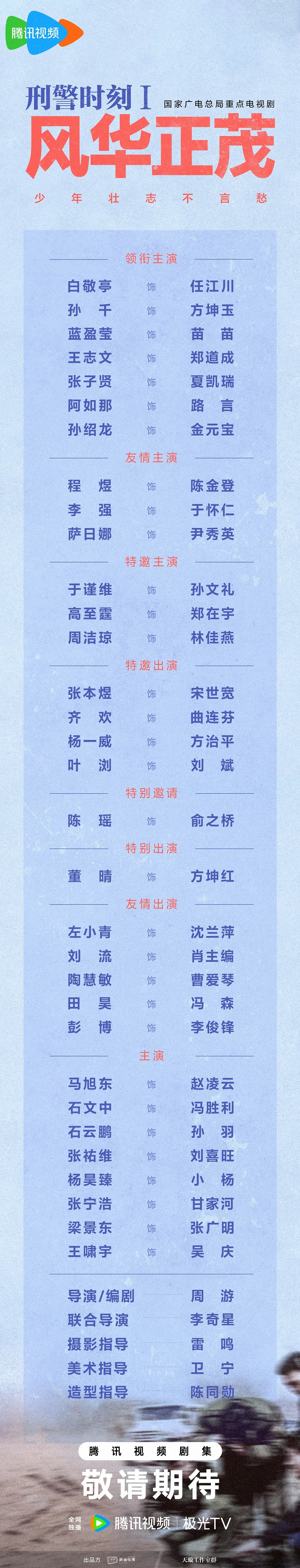 由新丽制作,公安题材涉案剧《#刑警时刻1风华正茂#》今日开机并官宣主演阵容,腾讯全网独播!