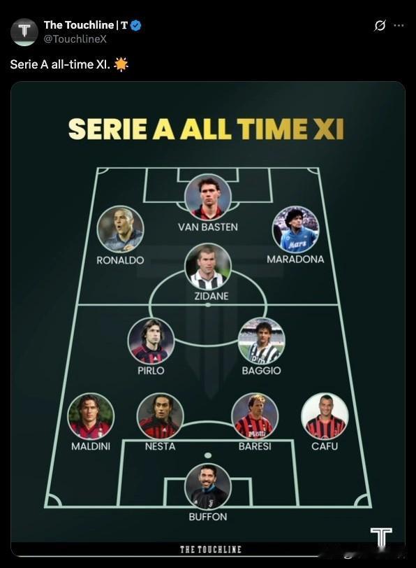 意甲联赛历史最佳阵容。看了半天巴乔的位置不对,那个位置也许里杰卡尔德甚至古力特更合适,巴乔是后腰肯定是不行的,理解排这个阵容的人,不能没有巴乔,但又不能用巴乔替代马拉多纳或者罗纳尔多。 巴乔是意大利球员的代表,同样也是国家代表性球星之一,而且工龄跟表现足够,只是荣誉不是很多,很多球迷说巴乔之所以被喜爱是因为他的悲情,我一直都不理解有啥悲情的?94世界杯是巴乔一个人的世界杯,他一个人扛着意大利到了决赛,没有巴乔意大利八分之一就凉凉了,可惜人心最难测,不理解为啥都那么健忘,都说巴乔点球失误,而忘记了巴乔之前做的。 还有就是罗纳尔多在意甲其实不算成功,联赛冠军欧冠冠军和最佳射手一个没有,只有一个欧洲联盟杯。齐达内在尤文图斯也是荣誉表现都不够给力,睡皮的荣誉累积的够多,但实力和表现个人觉得没资格比肩里杰卡尔德。齐达内那个位置也许普拉蒂尼更合适,当然普拉蒂尼现在口碑不行,风评更差,不提就不提了。