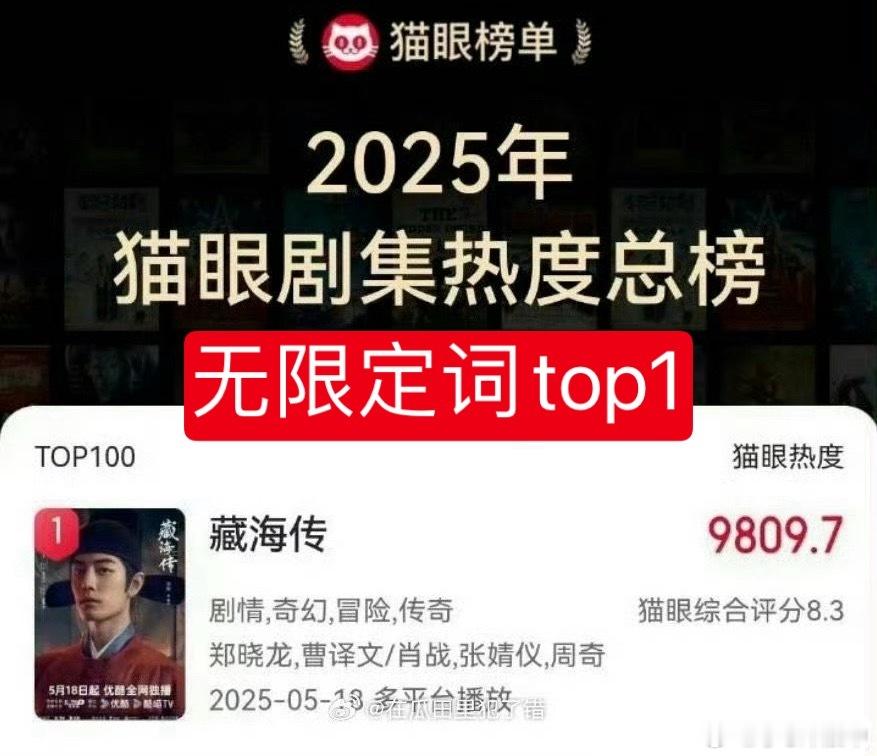 ·肖战藏海传猫眼剧集热度总榜第一(无限定词)!