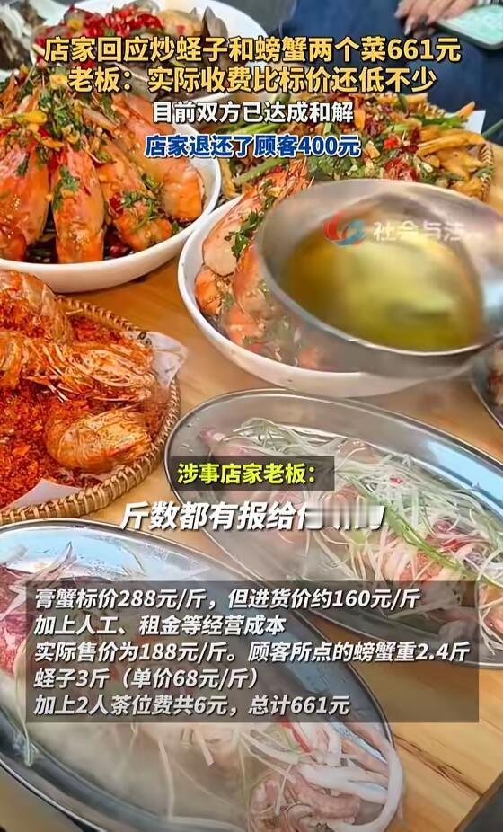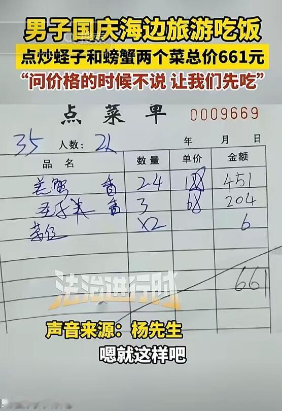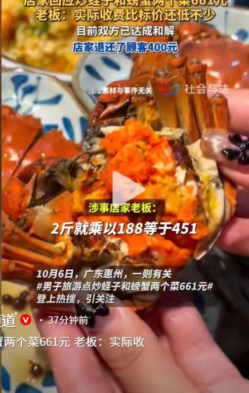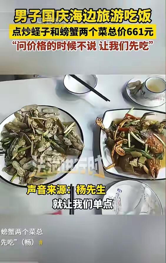 这年头吃个饭都能吃出“天价账单”,真是让人大开眼界。 惠州这家海鲜餐厅最近火了——一位游客带着家人,就点了俩菜,结账时傻眼了:661块!一份炒蛏子204,两只螃蟹451,这价格都快赶上五星级酒店了。 看看那盘子,就是普通家里的菜盘,蛏子没铺满,螃蟹也不大,怎么算都不值这个价。更离谱的是旁边那位大哥,三个菜直接被收了一千多。 其实这家店早就“恶评如潮”了。老板的套路很经典:不主动报价、不标单价、催着你点菜,等你吃完了才亮出天价账单。很多游客为了不破坏旅游心情,只能认栽付钱。 事后店家还嘴硬,说螃蟹188一斤,两只两斤多,所以收451。拜托,这数学是体育老师教的吗?188乘以2等于376,哪来的451?明摆着宰客。 最后店家退了400块和解了,但我觉得这处罚太轻了。这种“海鲜刺客”就该重罚,不然今天退400,明天继续坑下一个。 说实话,旅游区的餐厅适当加价能理解,但翻个五六倍就太过分了。现在网络这么发达,宰一个客人,坏的是整个地方的名声。 建议大家以后去旅游区吃饭: 一定问清楚是“一份”还是“一斤”的价格; 找明码标价的店; 老板要是含糊其辞,赶紧走人; 提前看看网友评价,避开这些雷区。 咱们花钱是为了开心,不是来当冤大头的。也希望这些店家明白,靠坑蒙拐骗做不长久,口碑坏了,最后亏的还是自己。