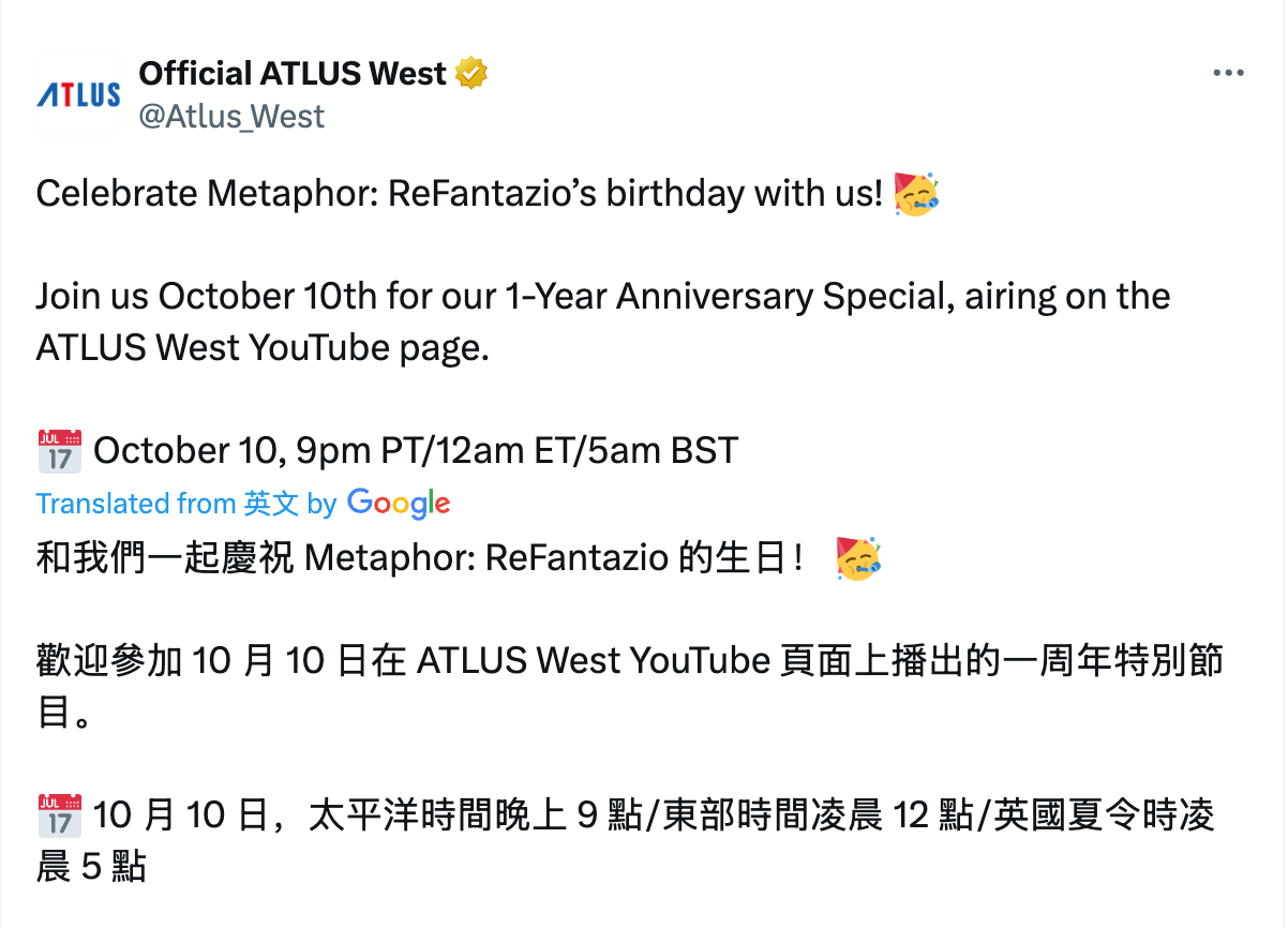 开发商Atlus宣布将于北京时间 10月11日中午12:00 举办《暗喻幻想》1周年特别直播活动,届时还将有全新情报释出。据悉,《暗喻幻想》于2024年10月11日在PS、Xbox和PC平台正式发售,首日销量便达到了100万份。暗喻幻想