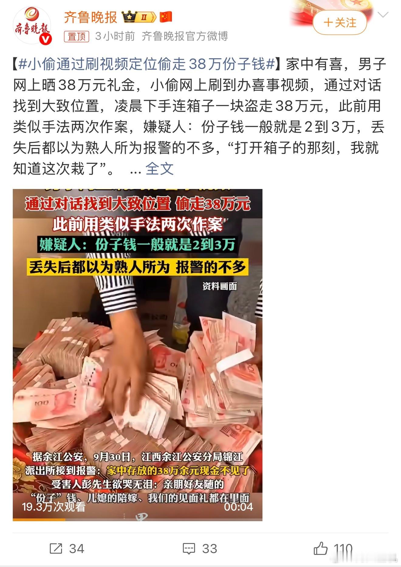 小偷通过刷视频定位偷走38万份子钱小偷通过视频定位偷走38万礼金,这已经不是小偷