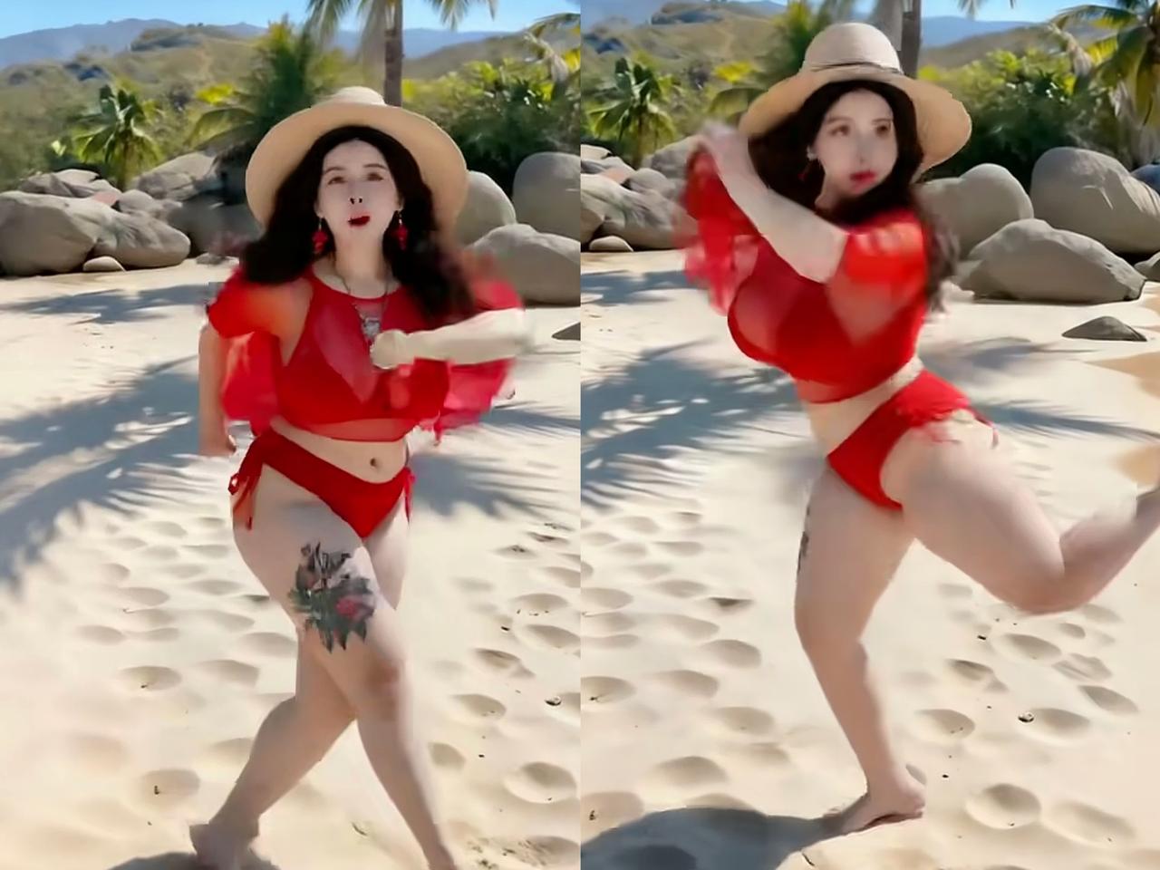 在椰风轻拂的沙滩上! 她一袭红装明媚吸睛,草帽点缀尽显度假氛围感!这组画面是不是