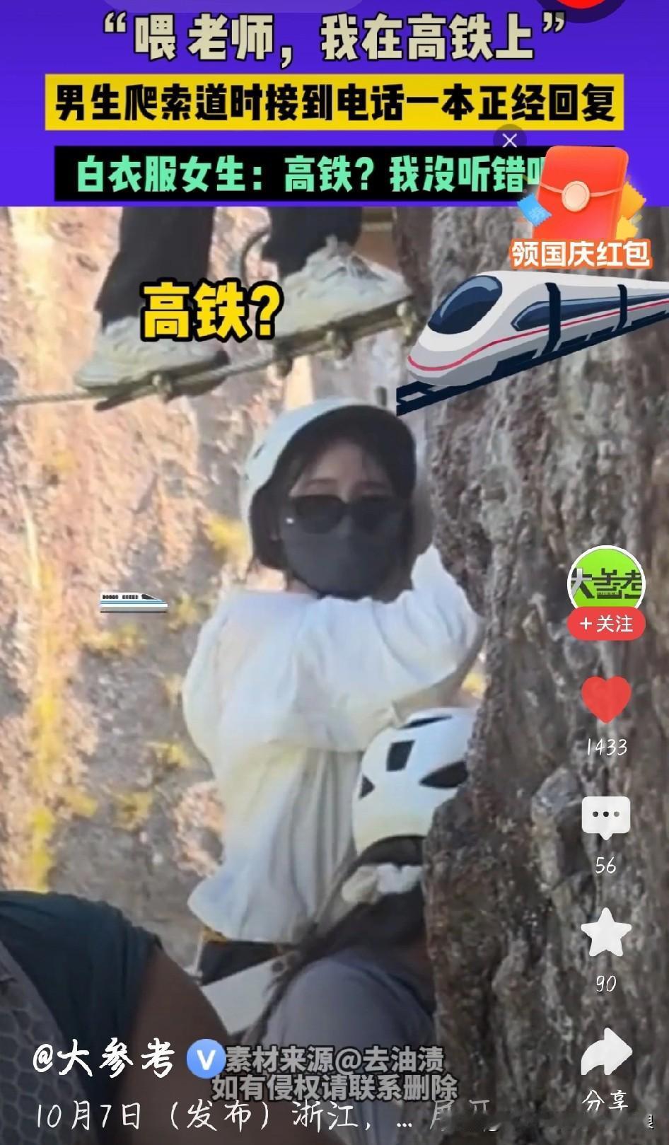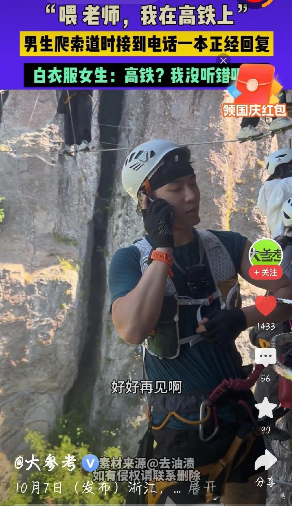 笑喷!男生索道上接电话,睁眼说瞎话太淡定 浙江一男生爬索道时接到电话,全程一本正经回复的样子,笑翻全网。 视频里他悬在半空中,脚下是山谷,手里还抓着安全绳,电话一接通立马切换严肃模式。听着像是老师催作业,他张口就来:“喂老师,我在高铁上呢,一会就发给您。” 旁边同行的女生当场憋笑,忍不住吐槽:“高铁?我没听错吧?” 挂了电话他自己也绷不住了,网友戏称这是“高空作业式撒谎”。 这反应速度绝了!一边是高空索道晃悠悠,一边是一本正经编瞎话,隔着屏幕都觉得又紧张又好笑。学生党这波“应急反应”,是不是戳中你的同款回忆了?男生爬索道时接到电话一本正经回复 睁眼说瞎话