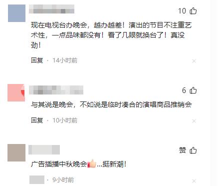中秋晚会之所以被吐槽,主要还是大家想看些与众不同、新颖的节目,可晚会呈现的效果,让人很是失望,更有网友直言:与其说是晚会,不如说是临时凑合的演唱商品推销会! 原本想和家人一块看看晚会应应景,没看多久,一家子脸色都不对了,只因广告多的超出想象,简直跟“牛皮癣”似的,不管你正看得入不入神,冷不丁就冒出来。 好不容易盼着能听会歌星们优雅的嗓音,结果跟预期的相差太大,这面向的可是全国百姓啊,在镜头前露了多次脸的人,唱的都找不到调,明显是没准备好就上台了。 以前看晚会,不管是歌手还是演员,都透着一股认真劲,台词、歌词背得滚瓜烂熟,现在倒好,那么多节目肯定不乏有好看的,但寥寥数几。 况且还是直播,没法拉进度条,想把节目办大办强,吸引更多人观看,邀请流量明星无可厚非,至少得保证实力在线。 大家想看什么显而易见,广告什么时候都能播,人家掏钱了想将产品露出来也能理解,但还是得把观众的体验感放在第一位,本来大伙过节就想图个开心,结果看得一肚子火。 要是以后晚会还这么搞,估计没几个人愿意看了,既然有了先例,就汲取教训,经典之所以能成为经典,肯定有一定道理,观众不可能无缘无故的捧场,还是得接地气。 对于这件事情,大家有什么看法?