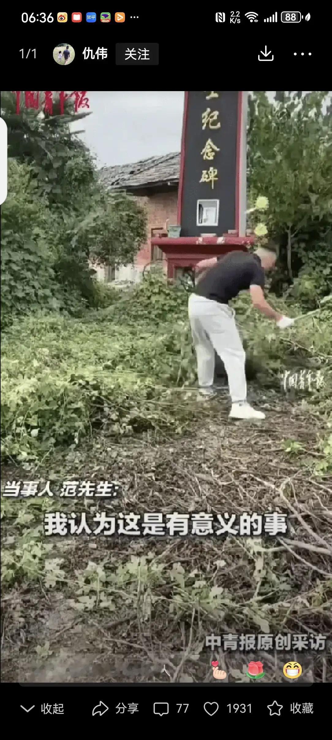 在湖北荆州监利县的一个普通村庄里,一座被杂草掩埋的烈士纪念碑,因为一位农民的偶然驻足,重新焕发出应有的庄严。9月30日,范大哥开车路过时,发现这座纪念碑几乎被野草吞没,他蹲下身拨开杂草,辨认着斑驳的碑文——“这里长眠的可是为我们拼过命的人啊”。 “这草,必须清!” 第二天清晨,范大哥带着镰刀、铁铲和扫帚回到碑前。看似简单的清理工作,实际却困难重重:杂草根系深扎土中,与碎砖瓦砾纠缠在一起。这个常年务农的汉子,跪在地上一点点刨开板结的泥土,汗水浸透了衣背。中途有村民路过好奇张望,但没人上前帮忙——直到三小时后,纪念碑终于重现全貌。范大哥回家换了件干净衬衫,对着纪念碑郑重敬礼。这一幕被偶然拍下,在网络上引发如潮感动。 生活的重担与心灵的净土 鲜为人知的是,这位“除草英雄”正经历着人生低谷。离婚后独自抚养女儿,种地的微薄收入要应付孩子的学费和生病老母亲的药费。有网友说:“他自己的人生都快被‘杂草’淹没了,却想着先给烈士‘拔草’。”但范大哥的回答朴素得令人动容:“日子再难,总比打仗那会儿强。这些烈士很多都没留下名字,我清个杂草算啥?” 一座碑照见的家国情怀 这座修建于上世纪50年代的纪念碑,埋葬着解放战争时期牺牲的12名无名烈士。村干部坦言,近年来只有清明会有学校组织扫墓,平时确实疏于维护。范大哥的举动像一块投入水中的石头——次日,镇里便派人加固了碑基,周边村民也开始自发轮流清扫。有退休教师带着学生来献花,孩子们问:“叔叔,你为什么要来除草?”范大哥搓着粗糙的手掌说:“因为你们课本里说的‘幸福生活’,就是这些人用命换来的。” 网友说 ▪ “他弯腰除草的姿势,比某些人的鞠躬更虔诚” ▪ 当地退伍军人事务局看到视频后,已启动全县烈士纪念设施排查 ▪ 公益组织为范大哥女儿提供了助学金,他婉拒其他捐助:“够吃够用就行” (本文碑文内容为保护隐私已做模糊处理) 在这个追逐流量的时代,总有人用最笨拙的方式守护着最珍贵的记忆。范大哥可能说不清“红色基因”这样的术语,但他用满手老茧告诉我们:对英雄的敬仰,不在朋友圈的转发,而在野草丛中的那一跪。您身边是否也有这样的无名守护者?欢迎提供线索,让我们一起点亮那些被遗忘的光亮。烈士碑 英雄墓碑