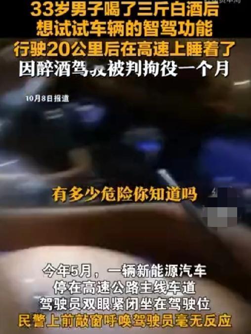 喝3斤白酒靠智驾开20公里 最后在高速上睡着一直不醒 是试技术?分明是拿自己和别