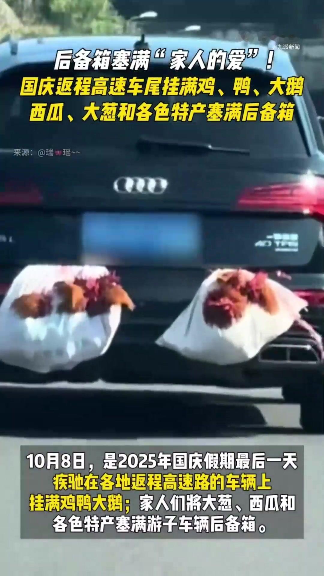 返程高速惊现“涡轮增鸭”!车尾挂满的鸡鸭大鹅,藏着最戳心的牵挂 “前方车屁股挂着四只大鸭,一路扑腾太抢镜!”国庆返程高速上,网友抓拍的画面戳中无数人——黑色轿车尾门绑着两个编织袋,袋里的活鸭时不时扑扇翅膀,被网友戏称“年度最佳外挂”“真正的涡轮增鸭”。这看似滑稽的场景里,藏着中国人最朴素的情感密码。 谁的返程行囊里,没装过这样的“沉甸甸”?湖南车主何先生的后备箱早被腊肉、酸豆角塞满,怕活鸭闷死才挂在车尾,走到江西还分给亲戚两只;广东清远的返程车更夸张,尾箱挂着七只鸡,网友笑称“这是父母给的‘移动菜场’”。从北方的笨鸡、鹅蛋,到南方的活鸭、腊味,车尾晃悠的禽畜和后备箱溢出的特产,本质都是长辈“恨不得把家搬给你”的执念。 但感动背后,藏着不容忽视的隐患。有网友在路上发现,前车挂着的活鸡突然挣脱,差点砸中后车挡风玻璃。交警早就提醒,这种外挂方式不仅可能遮挡车牌和尾灯,高速行驶中禽畜一旦掉落,还会引发后车司机慌乱,极易造成追尾事故。更关键的是,客运车辆违规载货已违反《道路交通安全法》,最高可罚200元,这份爱可别变成“麻烦”。 其实换种方式,牵挂照样能稳稳送达。用透气的专用笼子装活禽,固定在后备箱角落,既避免应激反应又保证安全;像网友罗女士家那样,把馒头、零食分箱打包,不遮挡后挡风玻璃,行车视野更清晰。河南农户李大叔的做法更聪明提前把活鸡处理干净真空包装,既省空间又符合规定,还不耽误孩子吃到家乡味。 当车流缓缓驶入城市,车尾的鸡鸭大鹅终将变成餐桌上的佳肴,而那份藏在其中的牵挂,会变成打拼的底气。只是下次返程,不妨把这份爱“妥帖安放”——毕竟平平安安到家,才是长辈最想看到的结果。 你返程带过最特别的家乡味是什么?有哪些安全带特产的小妙招?评论区聊聊~
