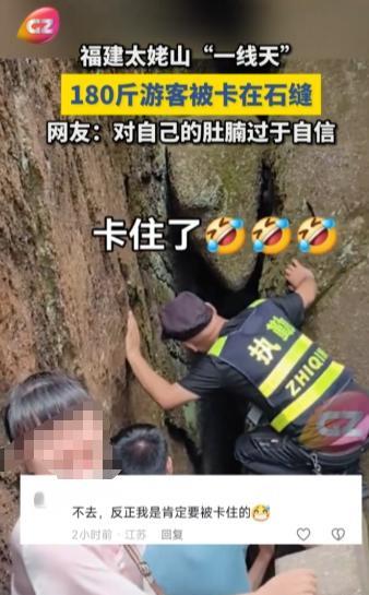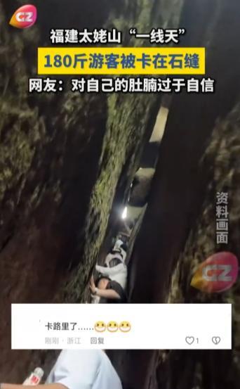 “离了个大谱!”10月6日,福建宁德,一180斤男子在游览山中“一线天”景区时,肚腩卡在了石缝之间,不管他怎么挣扎身体都纹丝不动,导致后面的游客上不去,前面的游客下不来,网友:对自己的肚腩过于自信了! 一些名山常会有“一线天”这种奇特的自然景观,“一线天”指的就是两块石壁之间有一条仅能供一人通过的窄缝,由于石壁遮挡,抬头望去只能看见窄窄的一线天幕,如果过于肥胖,通过“一线天”时可要小心了。 一名男子到当地一座名山游玩,这座山上有着“一线天”景观,不少游客慕名而来,排起长队等待看这大自然的鬼斧神工,男子也不例外。 男子的体重约有180斤,在经过窄缝时,他的肚腩竟然死死卡在岩壁之间动弹不得,不管男子怎么挣扎,他的都无法从两块岩壁中挣脱开来。 身后排着长队的游客见队伍每向前移动,纷纷翘头观望,被困住的男子急坏了,继续用力扭动自己的身体,好在最后他成功脱困。 不少网友认为男子对自己的身材过于自信,应该在进入窄缝前比照一下自己的身体,被困在这里还是相当危险的,在进入类似的景观时一定要对自己的身型有一个清晰的认知! 信息来源:《“一线天”180斤游客被卡石缝,网友:对自己的肚腩过于自信。》广州广播电视台