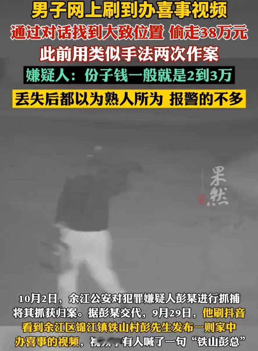 江西余江,儿子结婚,男子一高兴就发了不少视频,其中自然少不了“炫富”镜头,可没想到,第二天家里38万现金就不翼而飞,开始还以为是熟人下手,可报警找到人,才知道对方竟然是通过视频找到的位置。 据男子讲述。儿子结婚。从迎亲车队到酒店宴席,再到亲友欢聚的热闹场面,他拿着手机拍了个不停,兴奋劲儿上来,连着发了十几条短视频到社交平台,想让没到现场的朋友也沾沾喜气。 拍视频时,他没多想,镜头里不仅有新人的幸福瞬间,还无意间拍到了不少“露富”画面:给新人的现金红包堆在桌上,家里抽屉里准备的备用现金也入了镜,就连小区大门、单元楼号,甚至家门口的装饰摆件,都清清楚楚地留在了视频里。发完视频,他收到不少朋友的祝福。 第二天,男子准备用现金给帮忙的亲友结费用时,却傻了眼——藏在家里的38万现金不翼而飞。这些钱一部分是给儿子的婚后备用金,一部分是婚礼收的礼金,他特意找了个自认为安全的柜子锁着,如今柜门完好,里面的现金却没了踪影。 “肯定是熟人干的!不然谁知道钱藏在哪儿?”男子又急又气,第一时间报了警,还怀疑过家里的亲戚、帮忙的邻居。可民警调取监控后发现,案发当天凌晨,有个陌生男子鬼鬼祟祟地在他家单元楼附近徘徊,随后撬窗进入室内,得手后迅速离开。 经过几天侦查,民警很快锁定了嫌疑人并将其抓获。面对审讯,嫌疑人的供述让男子恍然大悟:原来他刷短视频时刷到了男子发的婚礼视频,从视频里的小区环境、楼号、家门口细节,一步步摸清了具体位置;又看到视频里的现金,断定这家人“有钱”,便起了歹念,趁着凌晨没人,撬窗偷走了现金。