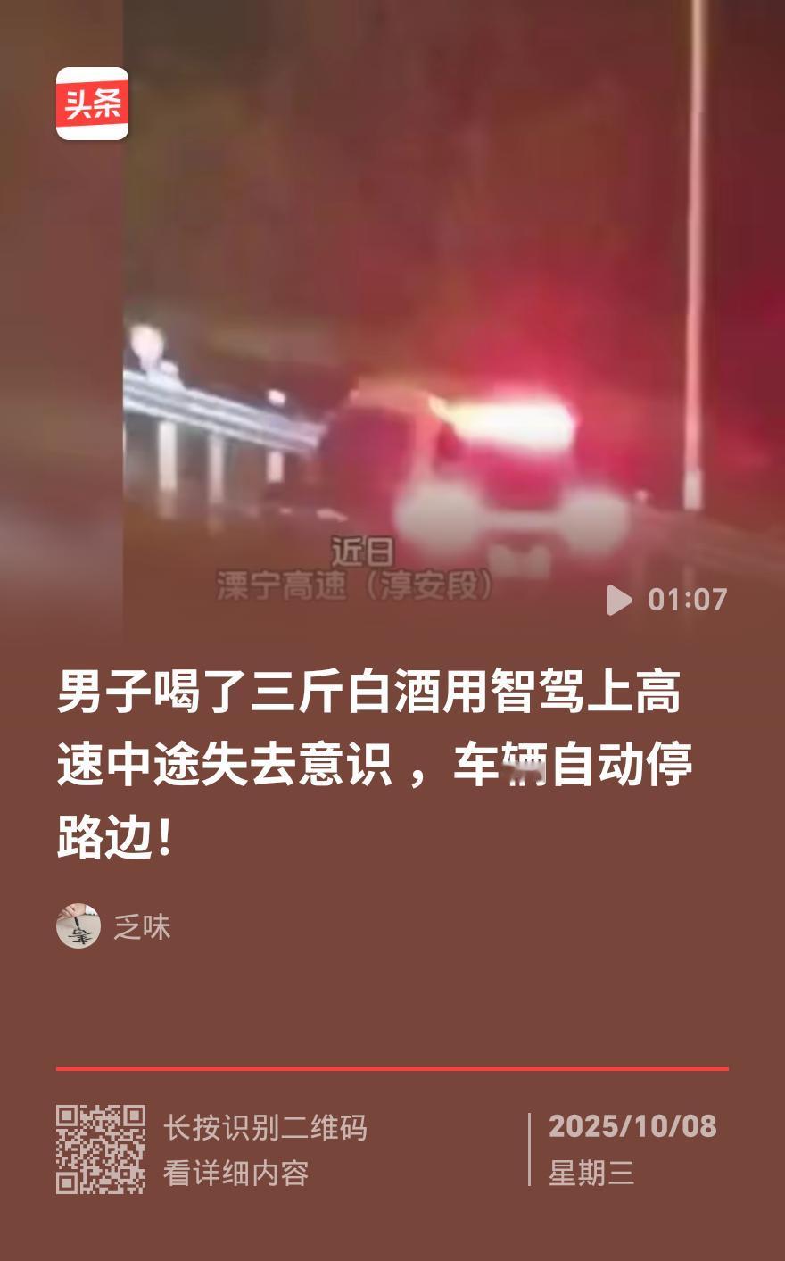 疯了!33岁男喝3斤白酒试智驾,开20公里睡高速,被判拘役1个月 33岁的他,喝了三斤白酒后脑子一热,竟想试试自家车的智驾功能。朋友拦着说“你这是玩命”,他却拍着方向盘说“高科技靠谱”,硬是开着车上了高速。 刚上路时他还能眯着眼盯屏幕,三斤白酒的劲上来后,眼皮沉得像挂了铅块。智驾系统一个劲提示“请保持专注”,他胡乱按了两下,没几分钟就歪在座椅上打起了呼噜。车子靠着智驾在高速慢车道上“晃悠”,幸好被巡逻交警及时发现。 交警敲了半天车窗,他才迷迷糊糊醒过来,嘴里还嘟囔“我这智驾挺稳啊”。酒精测试仪一测,数值直接爆表。他还跟交警掰扯“我没自己开,是车自己跑的”,可法院不认这套——认定他醉酒后启动车辆并使用智驾,仍属醉酒驾驶,最后判了拘役一个月。 驾照没了,还得蹲看守所,留下案底影响工作生活。现在智驾是方便,可也不能当醉酒开车的“挡箭牌”啊。你说这人是太信高科技,还是喝糊涂了?要是你朋友这么干,你会怎么拦他?智驾驾驶 饮酒驾驶 疲劳驾驶酒驾