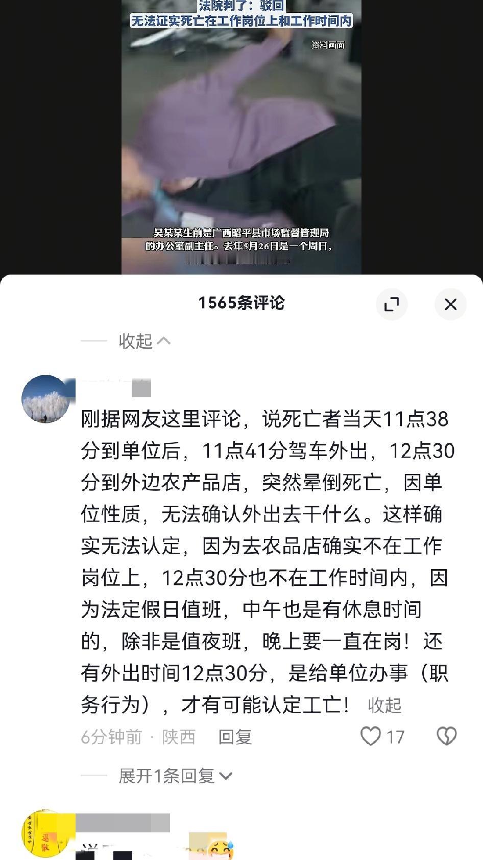市监局办公室副主任值班当天猝死,当地人社局做出“不予认定工伤”的决定,家属起诉人社局,法院一审二审驳回诉讼请求,原因是无法证实死亡在工作岗位和工作时间内。 很多网友为此抱不平!新闻说“在值班当天猝死”,单位的值班签到表、监控、保安、同事都可以证明,但是不论人社局还是法院,三次都不予认定工伤,也就是说上面这些证据都不能证明他在单位值班,极大可能是脱岗了。 有评论说,他11点38分到单位,11点41分驾车外出,12点30分到外边的土特产店,突然晕倒不省人事。这样看来,也很难判定工伤。 当然,站在家属的角度,人的死亡,可能与到单位值班有关,所以得据理力争,算是对死者的告慰!