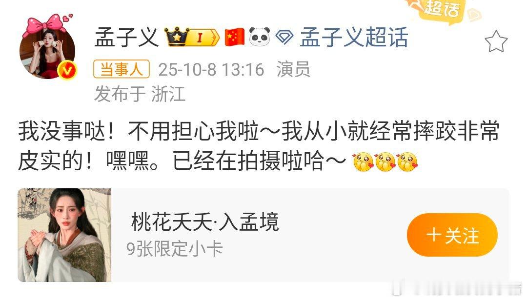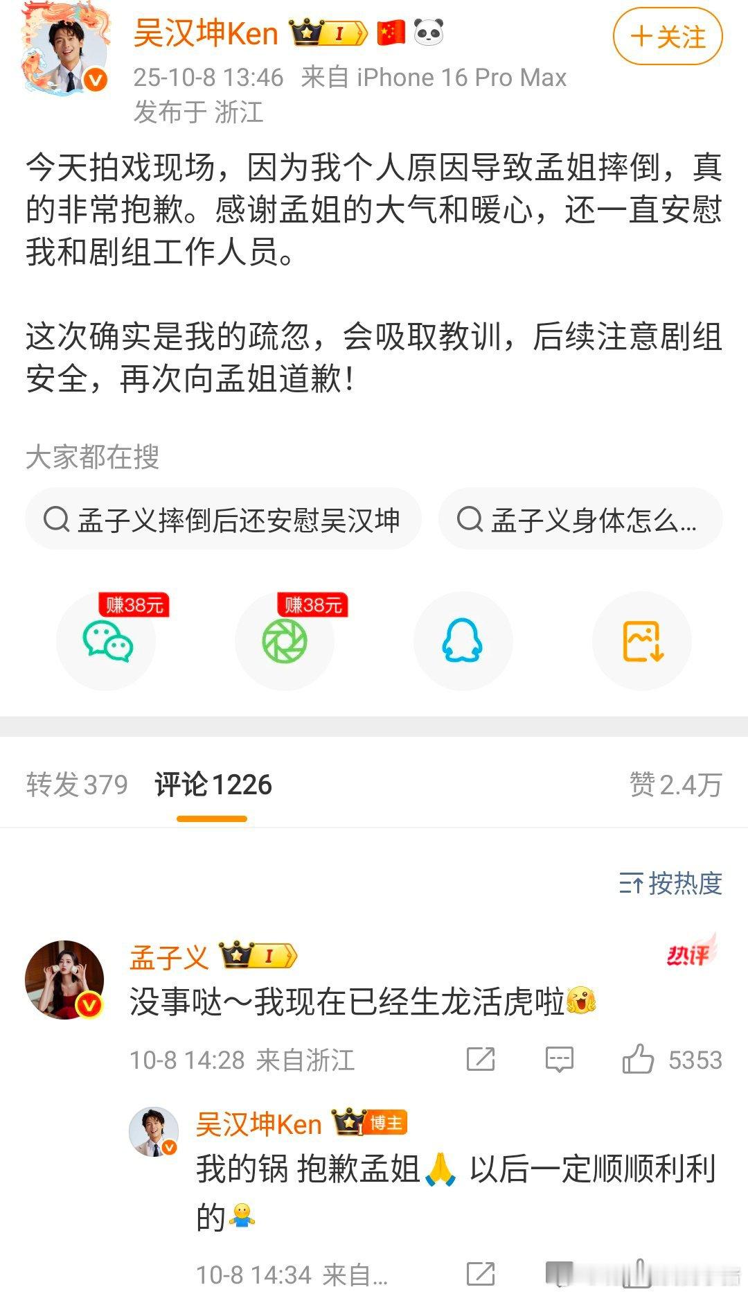 omg,孟子义拍戏是因为吴汉坤踩到才摔的,工作室还先报平安了,孟子义也在超话安抚粉丝了,怎么吴汉坤粉丝还这样🌚🌚🌚