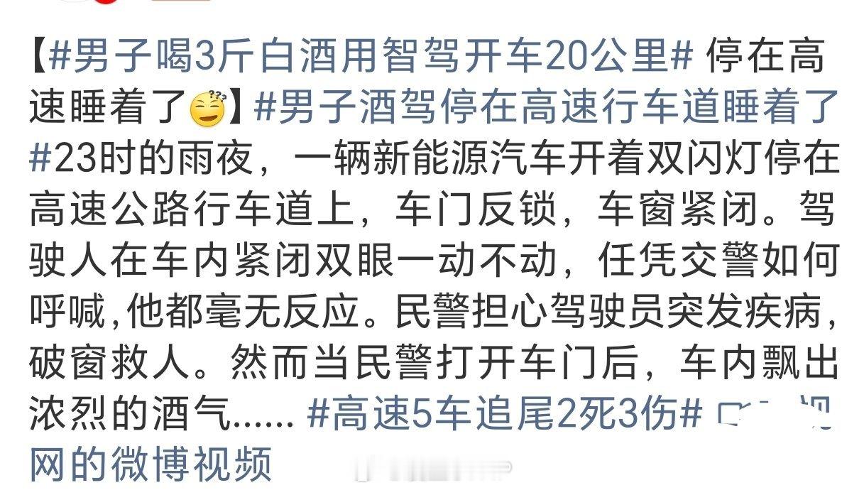 “男子喝3斤白酒用智驾开车20公里”与“高速5车追尾2死3伤”毫无关系。各是一个地方,媒体为了流量,把两个话题连在一起误导。