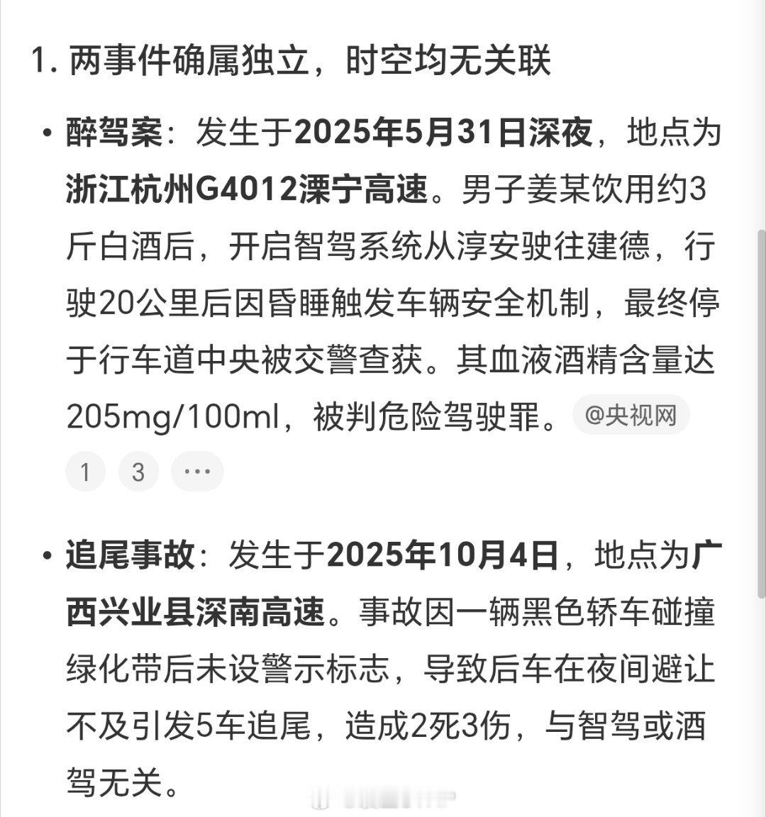 “男子喝3斤白酒用智驾开车20公里”与“高速5车追尾2死3伤”毫无关系。各是一个