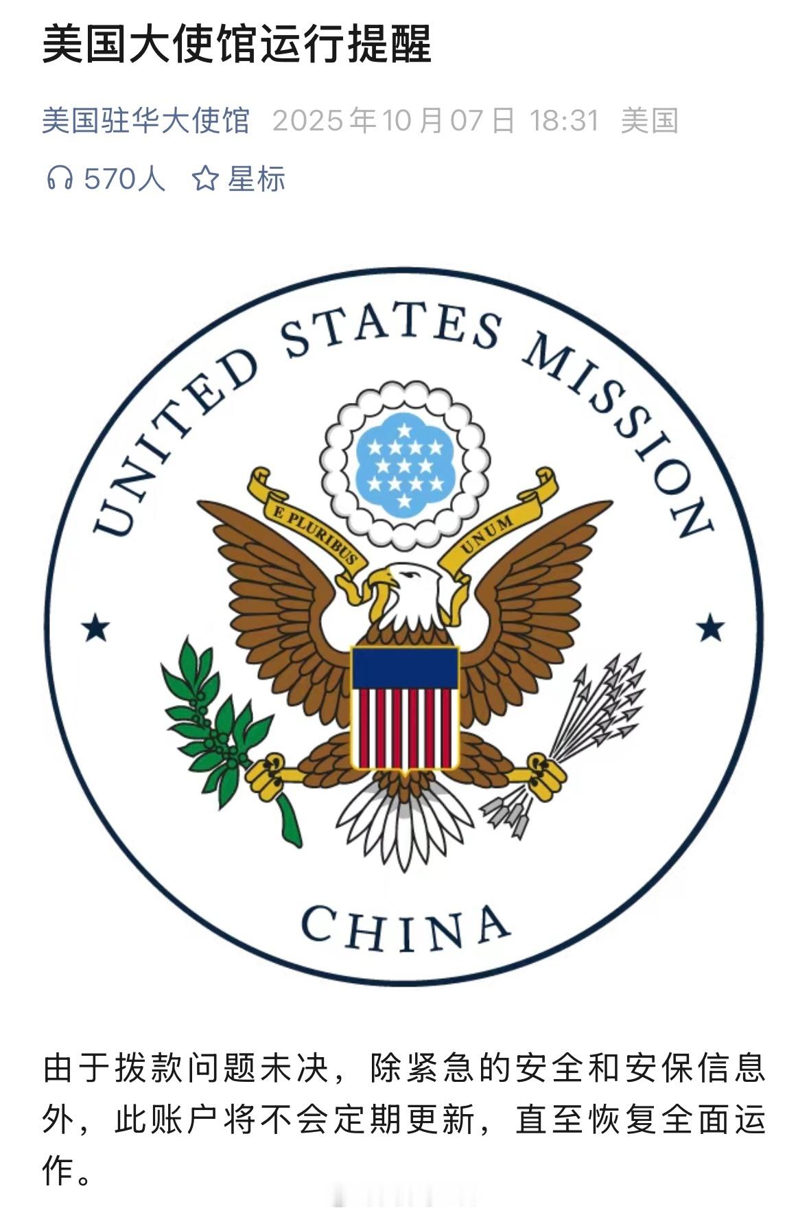 美驻华大使馆宣布微博微信停更