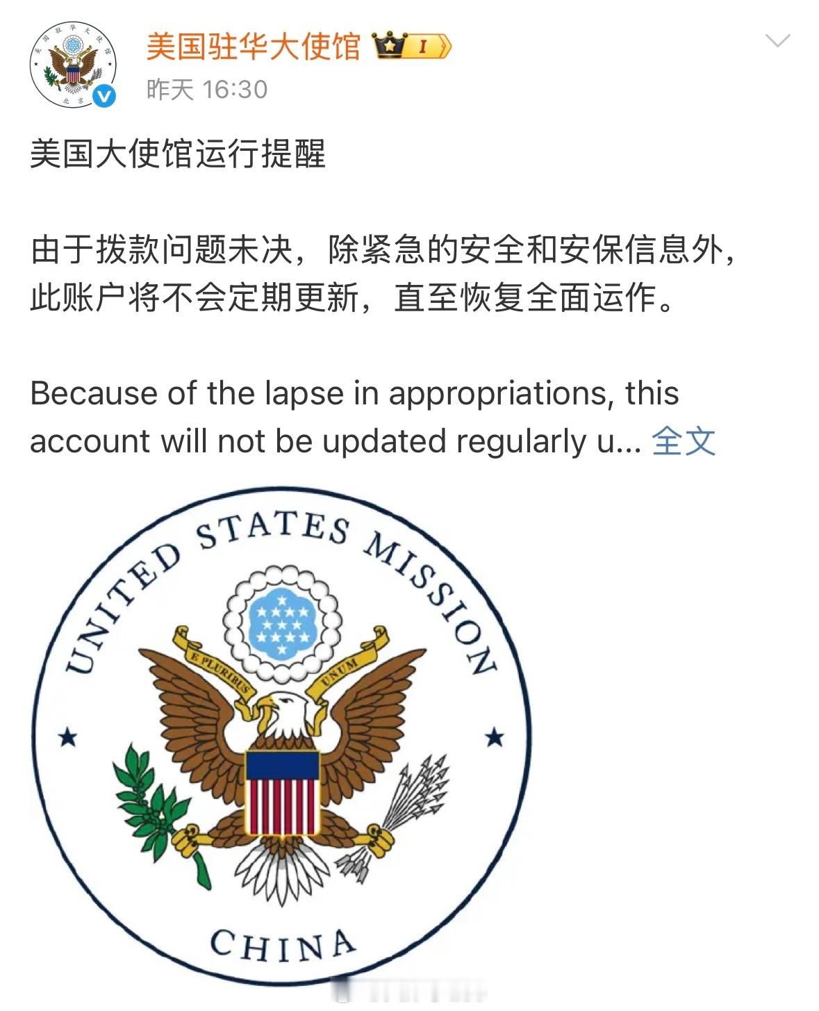 X 微博 微信全部停更美驻华大使馆宣布微博微信停更