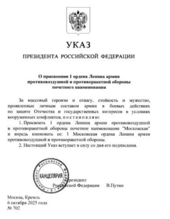 当地时间10月6日,俄罗斯联邦总统弗拉基米尔·普京签署第702号、第703号和第704号总统令,授予俄罗斯空天军特种防空反导第1集团军列宁勋章和“莫斯科”荣誉称号。 这绝非普通的荣誉授予,而是对该部队在保卫首都安全中卓越表现的直接认可,更是俄罗斯在复杂安全环境下对国土防空体系核心力量的一次战略凸显。 要理解这次授勋的分量,首先得看清这两个荣誉的特殊意义。列宁勋章作为苏联时期设立的最高荣誉之一,在俄罗斯联邦时期依然保留着崇高地位,仅授予在国防、科研、生产等领域做出突破性贡献的集体或个人。 而“莫斯科”荣誉称号则更具特殊历史厚重感,此前多授予在伟大卫国战争中保卫首都的功勋部队,如今将这一称号授予现役防空部队,足见其在当前莫斯科防御体系中的支柱作用。 俄罗斯空天军特种防空反导第1集团军本身就是一支承载着特殊使命的战略部队。 作为直接负责莫斯科地区防空反导任务的核心力量,它继承了苏联防空部队的精华遗产,如今更是整合了S-400“凯旋”、S-500“普罗米修斯”等最先进的防空反导系统,构建起覆盖高中低空、远中近程的多层防御网。 不同于其他在俄乌冲突前线作战的集团军,这支部队虽未直接参与地面战斗,却肩负着守护国家政治心脏的特殊责任——莫斯科作为俄罗斯的象征,其安全直接关系到国家稳定和民众信心,任何防空疏漏都可能引发难以估量的后果。 此次授勋的直接诱因,源于该部队在近年保卫莫斯科安全的实战中展现出的过硬本领。 自2022年俄乌冲突爆发以来,莫斯科多次遭遇无人机袭击,尤其是2025年A100预警机项目因技术和资金问题下马后,俄空天军预警体系一度面临巨大压力,乌军无人机曾多次试图突破首都防空圈。 正是防空反导第1集团军通过优化现有装备部署、强化多兵种协同作战、升级电子对抗系统等手段,迅速弥补了预警漏洞。 据俄国防部公开数据,2024年至2025年9月间,该部队成功拦截了超过95%的针对莫斯科的空中目标,其中包括多架携带爆炸物的自杀式无人机和弹道导弹模拟目标。 在2025年8月的一次大规模无人机袭击中,该集团军在短短20分钟内连续击落12架来袭无人机,无任何一架突破核心防御区,这样的拦截效率在现代城市防空作战中堪称典范。 从更深层次看,这次授勋也是俄罗斯在当前国际安全形势下的一次战略表态。 随着北约持续东扩,欧洲方向的防空压力与日俱增,美国及其盟友不断在俄罗斯周边部署先进武器系统,莫斯科面临的空中威胁已从传统军事打击扩展到无人机、巡航导弹、高超音速武器等多种新型威胁。 防空反导第1集团军作为首都防空的“钢铁盾牌”,其战斗力直接体现了俄罗斯抵御外部军事压力的核心能力。 普京选择在此时授予该部队双重荣誉,既是对其既往功绩的肯定,更是向外界释放明确信号——俄罗斯有能力捍卫核心利益,任何针对莫斯科的军事挑衅都将遭到坚决反击。 值得注意的是,这支部队的建设历程本身就是俄罗斯空天军转型发展的缩影。自2015年俄罗斯空天军组建以来,防空反导力量始终是建设重点。 第1集团军通过编制体制改革,将防空导弹部队、雷达部队、电子对抗部队、预警机部队等整合为一体化作战力量,实现了“探测-识别-跟踪-拦截”的无缝衔接。 在装备更新方面,该部队率先列装S-500防空反导系统,具备拦截高超音速武器和低轨道卫星的能力,成为全球少数能同时应对多种空天威胁的精锐部队。 这种体系化、信息化的建设成果,在此次授勋中得到了最高层面的认可。 对于俄罗斯民众而言,这支部队的荣誉也承载着特殊的情感意义。莫斯科市民对防空安全的关注度极高,每次防空警报响起都牵动着全国人心。防空反导第1集团军的稳定表现,不仅守护了物理层面的安全,更维系着民众对国家防务能力的信任。 授勋消息公布后,莫斯科街头出现了自发支持军队的活动,民众普遍认为这一荣誉实至名归。 在当前复杂的地缘政治格局下,这次授勋绝非偶然事件。它既是对一支英雄部队的褒奖,更是俄罗斯维护国家主权和安全的战略宣示。 防空反导第1集团军获得的列宁勋章和“莫斯科”荣誉称号,不仅是历史的见证,更是未来的责任。 随着各类新型空天威胁的不断涌现,这支部队将继续承担起守护首都安全的重任,而这份沉甸甸的荣誉,也将激励着俄罗斯空天军不断提升防御能力,为国家的和平与稳定筑起坚不可摧的空中屏障。