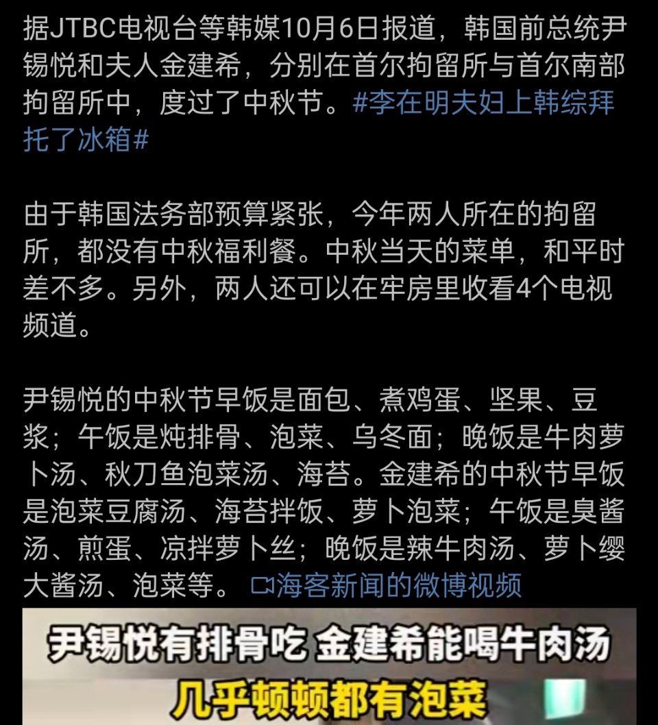 尹锡悦夫妇中秋节牢饭曝光🔻尹锡悦夫妇每天就吃这个,甚至不如深圳中小学午餐。韩国媒体还要强调尹锡悦有排骨吃,金建希有牛肉汤喝,似乎在韩国是非常不得了的美味一样。