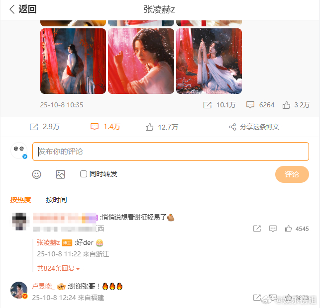 张凌赫宣传卢昱晓入青云卢昱晓新剧《入青云》今日开播,张凌赫转发为其宣传,卢昱晓回复:谢谢张哥,期待卢昱晓明意,也期待张凌赫谢征[打call][打call][打call]入青云